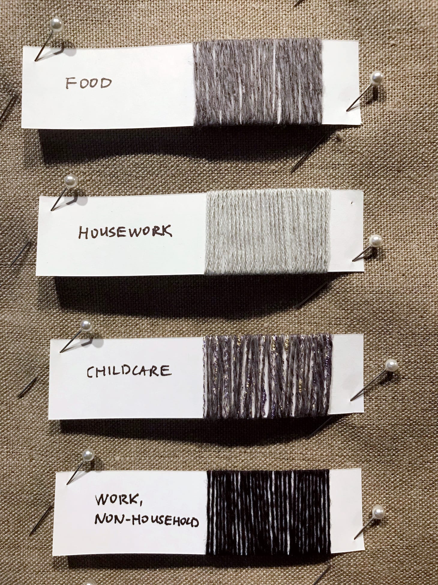 Lee doesn’t entirely focus on computer history, though. She also addresses the idea of women’s work more personally. One of her pieces, “Timesheet,” is a woven tapestry that breaks down how she spent a week-long period last year. An array of colored threads stand for activities like sleep, child care, and “work, non-household.” Taking advantage of the loom’s ability to make patterns, Lee blends threads in various blocks of time to show multiple activities taking place together. In the evening, she multitasks childcare duties with art making, representing it in a high-contrast blue and gray nailhead pattern. As Lee’s residency goes on, she will add six more timesheets to show how varied her weeks as a mother, artist, and programmer can be.