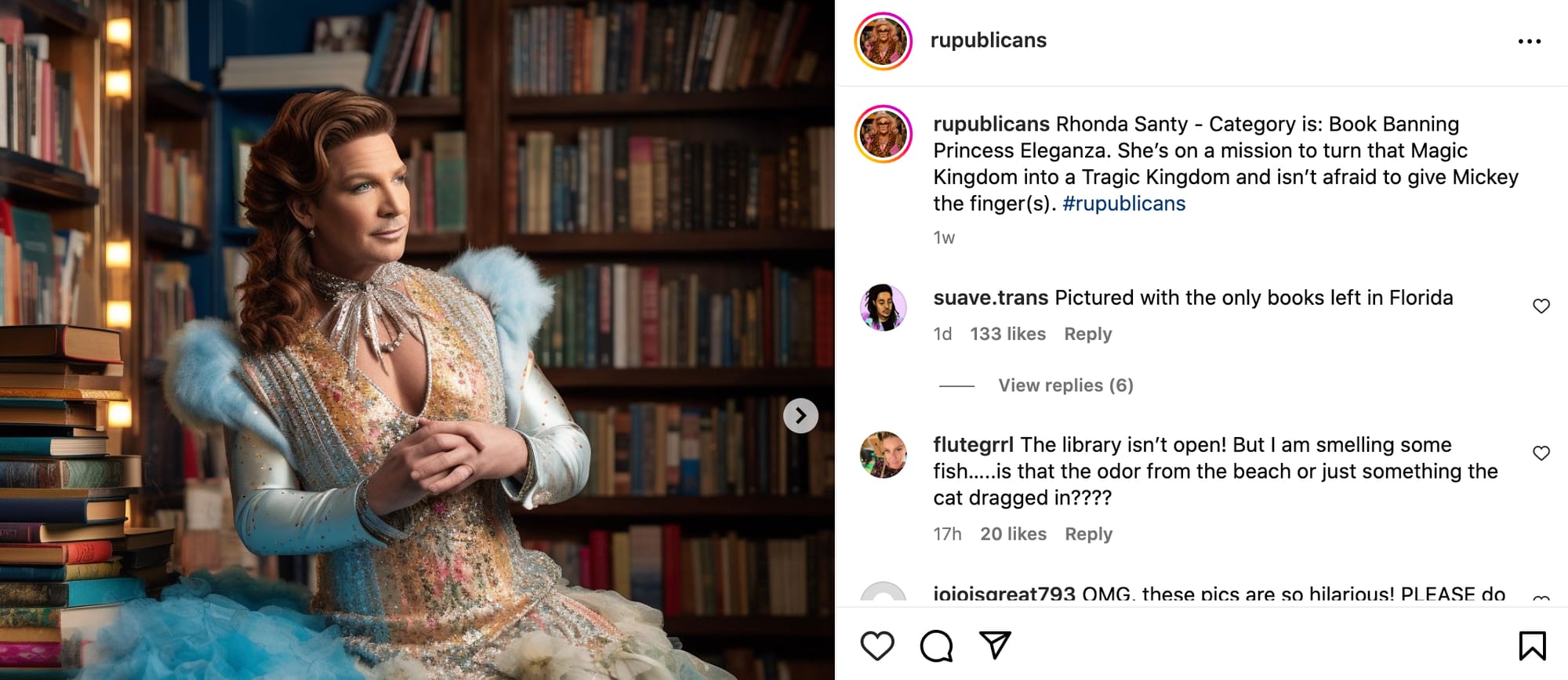 The comments on the posts are equally hilarious. One AI portrait of Ron DeSantis — "Rhonda Shanty" — sitting in a bookstore wearing a puffy-sleeved gown brought hundreds of comments. "Pictured with the only books left in Florida," said one user, referencing the Republican governor's crackdown on critical race theory and learning in general.