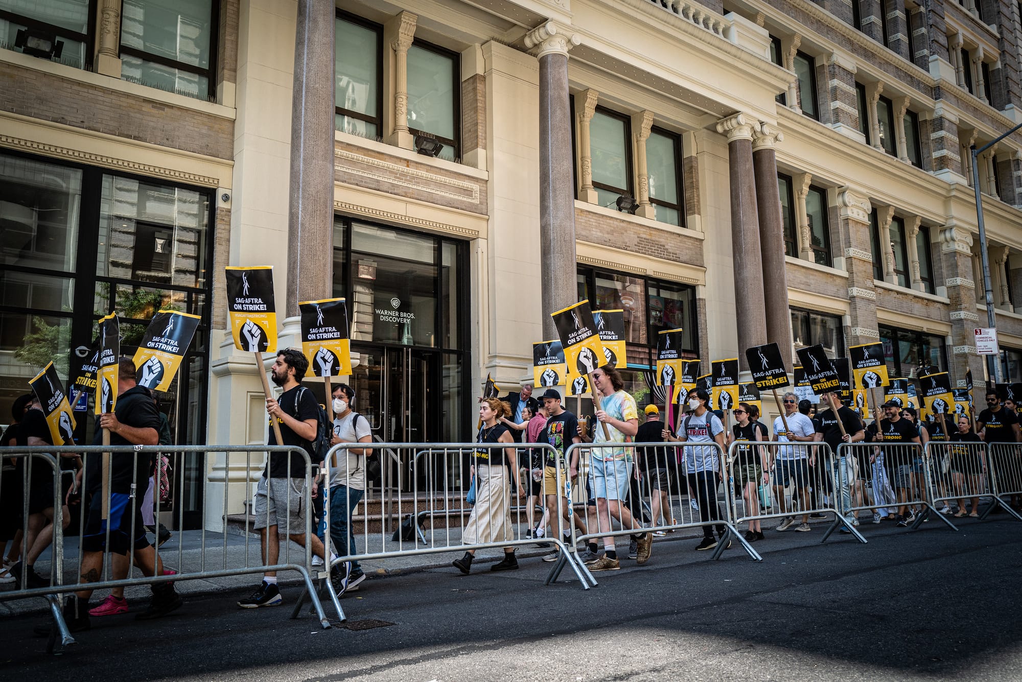 A SAG-AFTRA picket in front of the Warner Brothers offices in Manhattan in July 2023 (photo by Phil Roeder via Flickr)