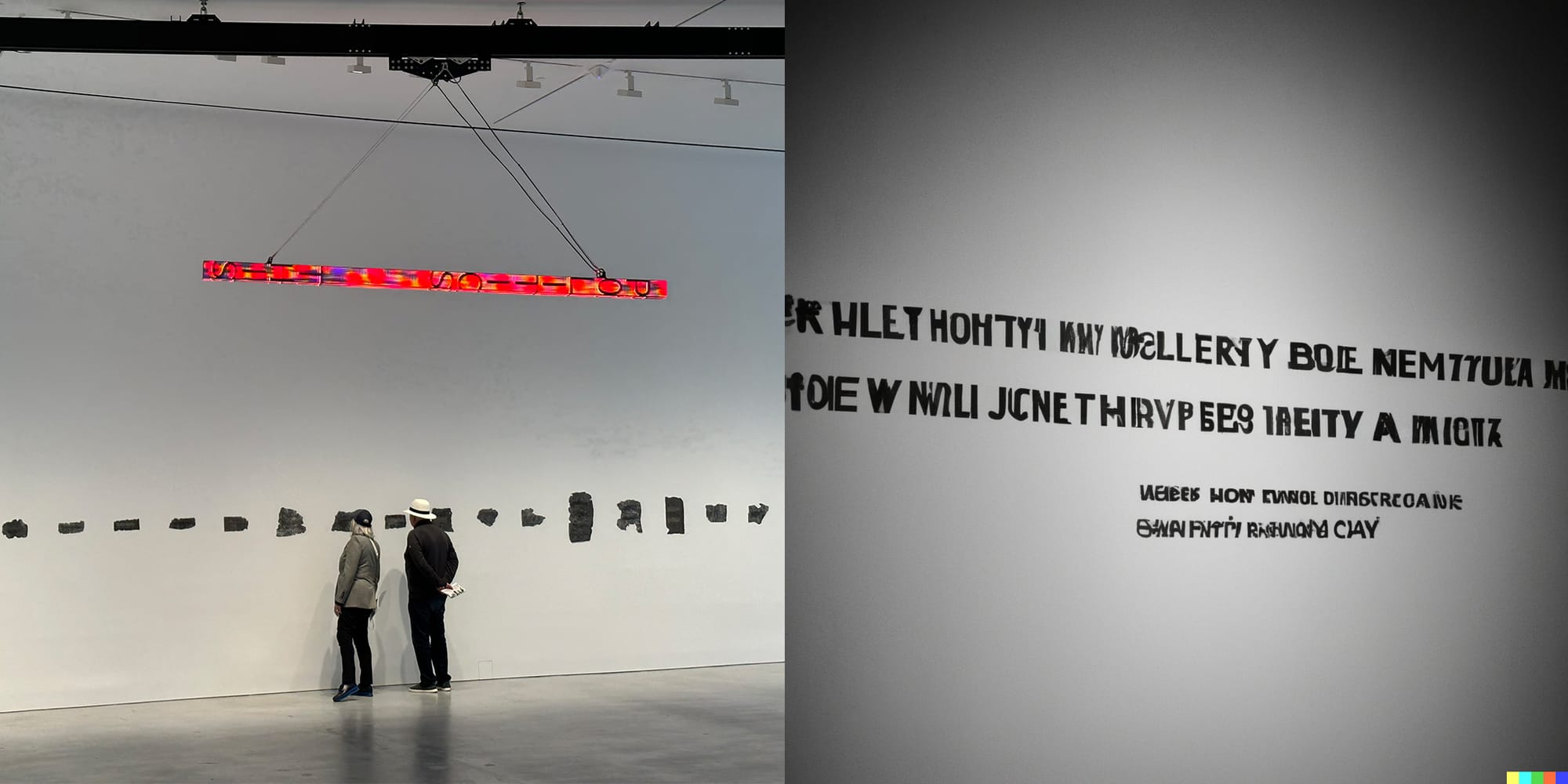 This example reveals a weakness in the current DALL-E system, which is text. The AI system renders all text as gibberish, which is curious, but then again Jenny Holzer's text nowadays is becoming harder and harder to read. The image on the right could easily be mistaken for the work of Holzer, maybe one that "questions legibility and our ability to read without understanding …" Sorry, I couldn't resist.