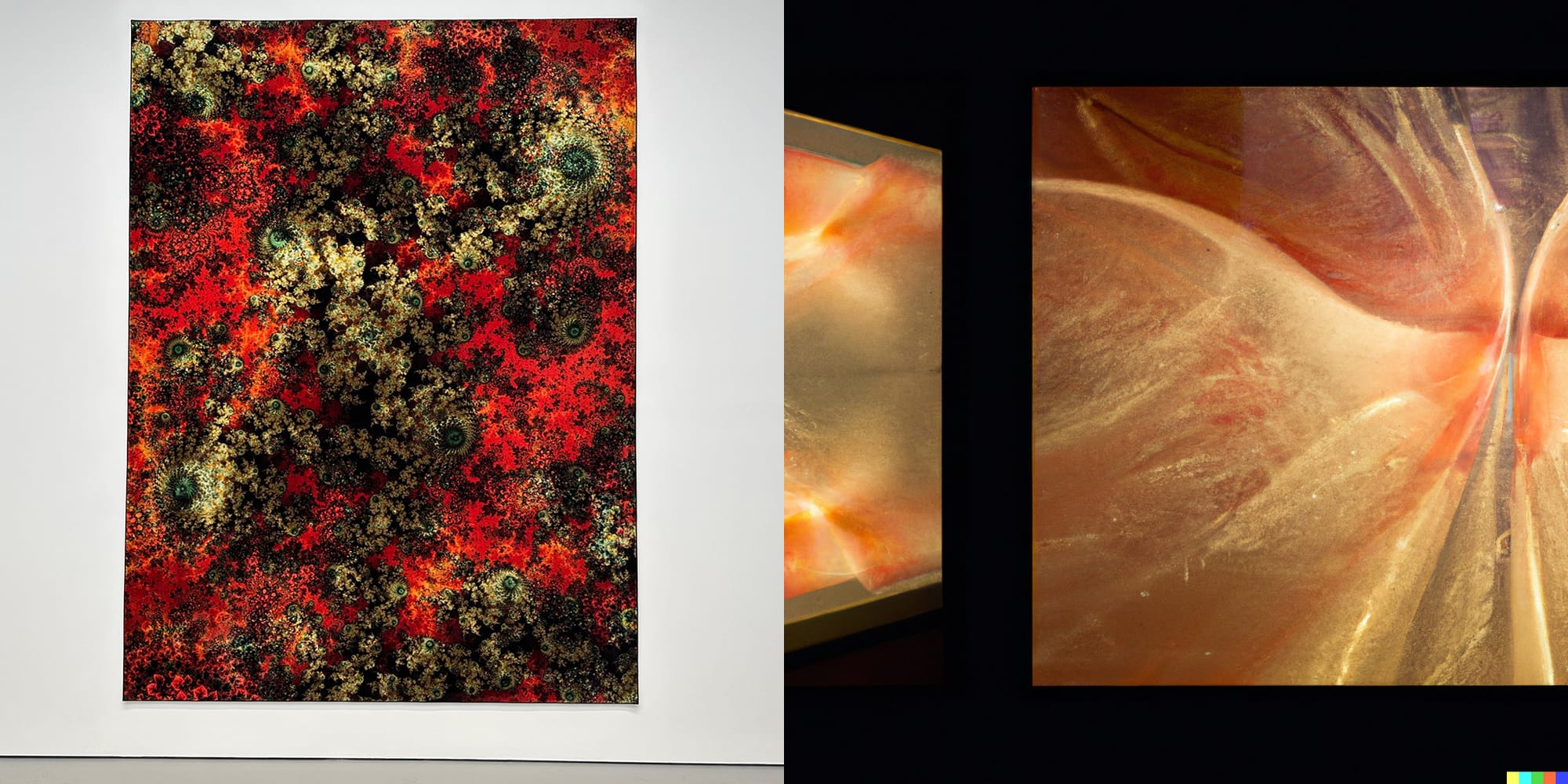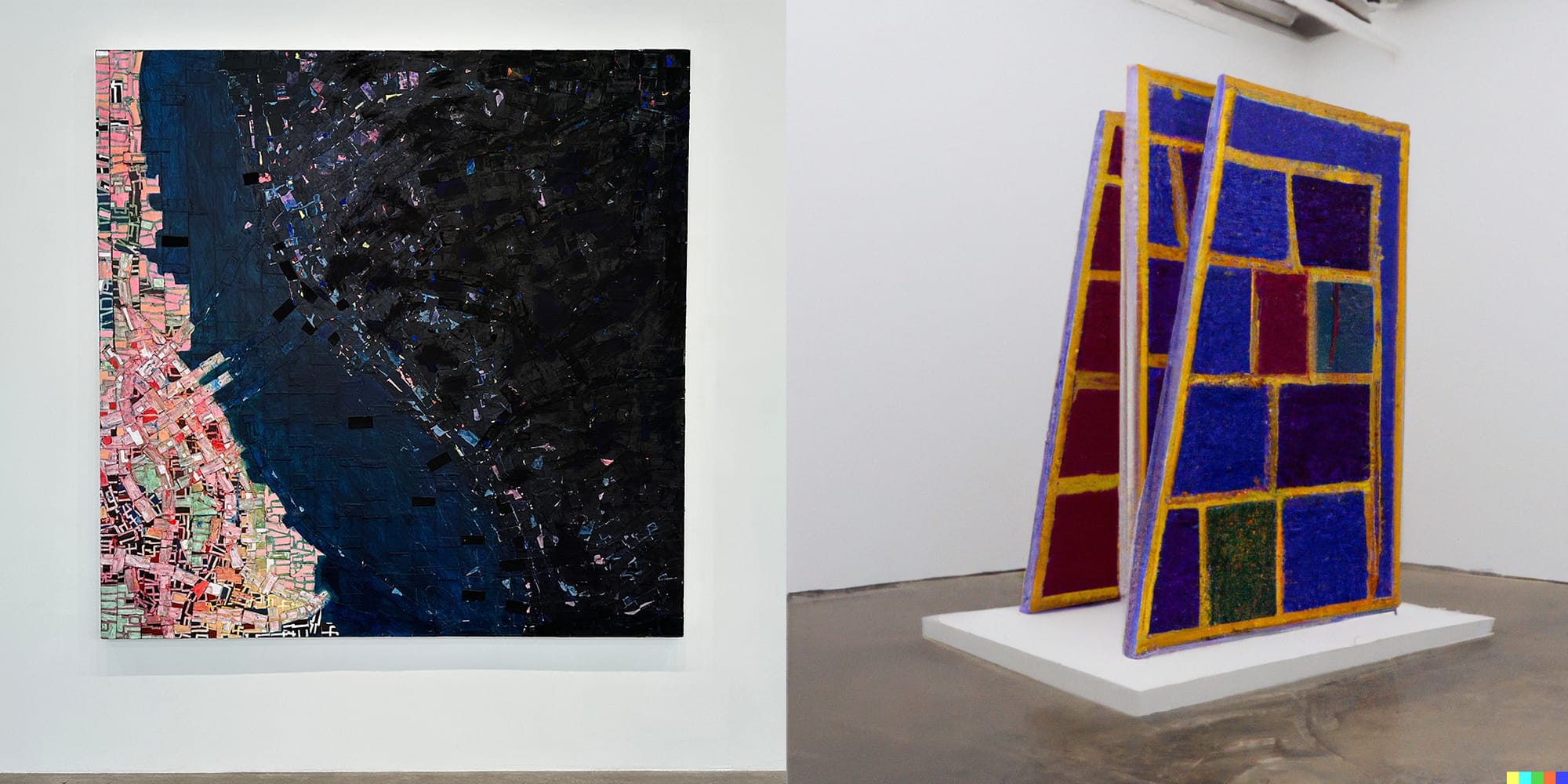 In contemporary art, art observers have long noticed how artists when they enter the land of blue-chip galleries start churning out increasingly similar and mundane pieces, often turning aesthetic innovations into branded objects for the very wealthy. So, I thought I'd try using press releases from five "blue-chip" (aka really expensive) art galleries in New York City — or at least as much of the press release that the AI system would allow me to input — and see how DALL-E (one of the most popular AI tools nowadays) reimagined the exhibitions using only those words.