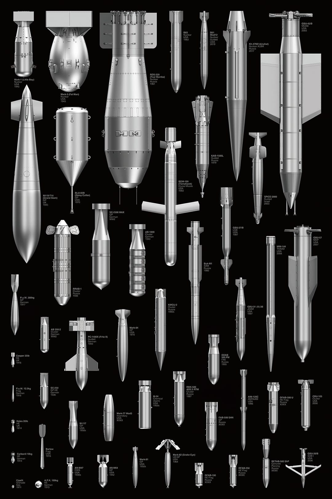 This dramatic, large-scale print is a compilation of 3-D renderings of 50 conventional weapons and weapons of mass destruction developed by a number of countries. The bombs are arranged chronologically, from a 1911 grenade to a 2019 guided nuclear missile. The work is the latest in the artist’s ongoing investigation of the global refugee crisis and armed conflicts across the world.
