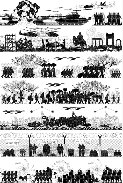 Odyssey, a 24×36” print, depicts the global refugee condition in the style of a classic Greco-Roman frieze. It is available for $100 (quantity 1,000).