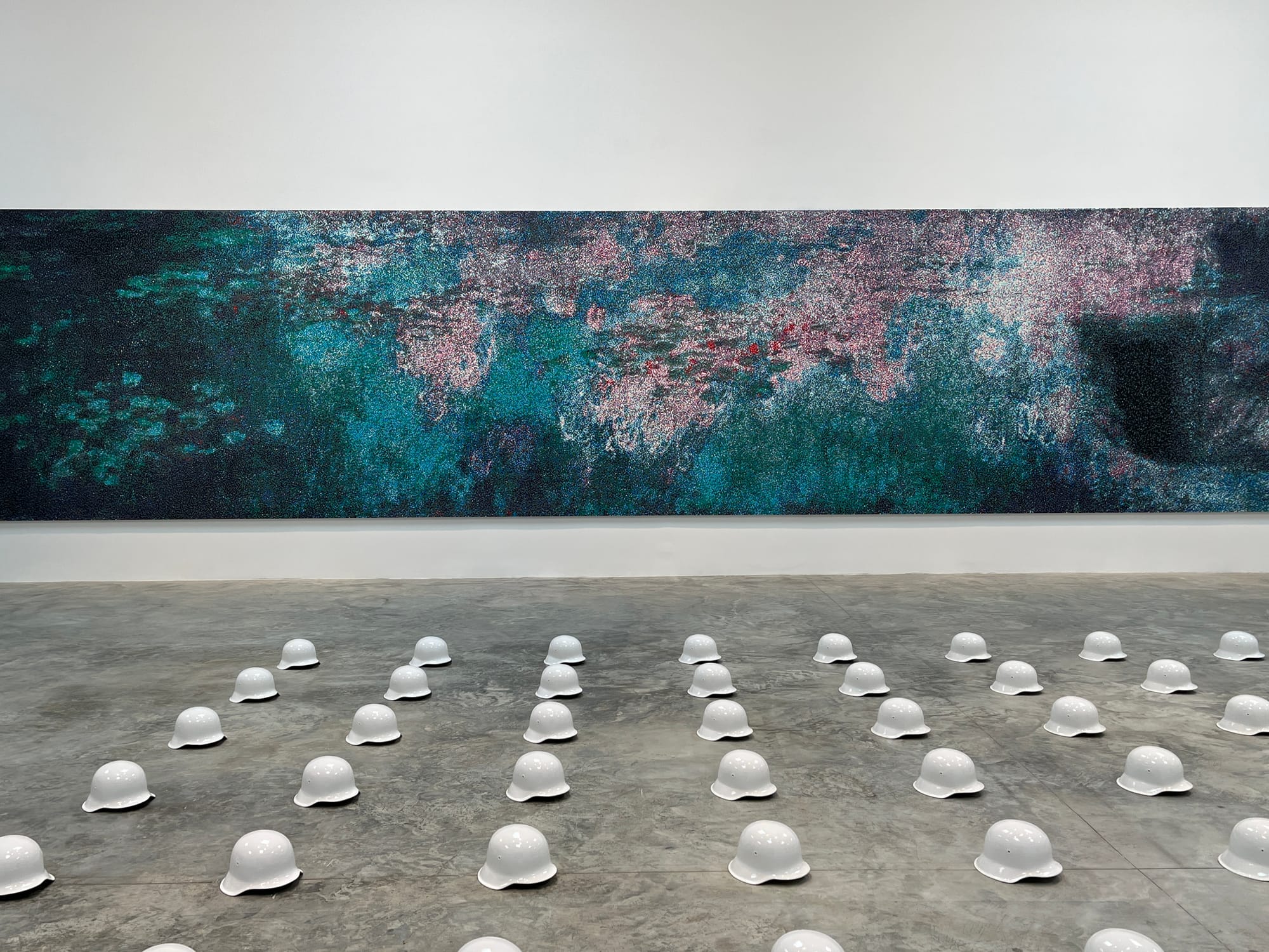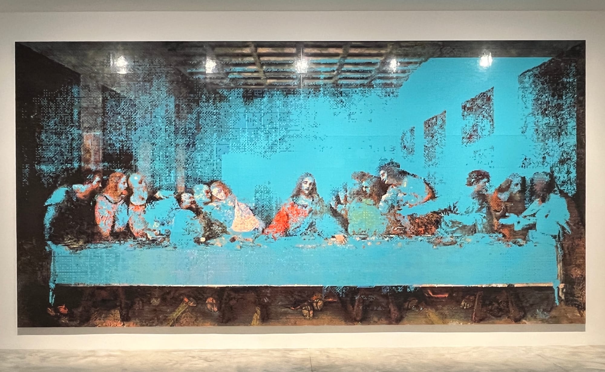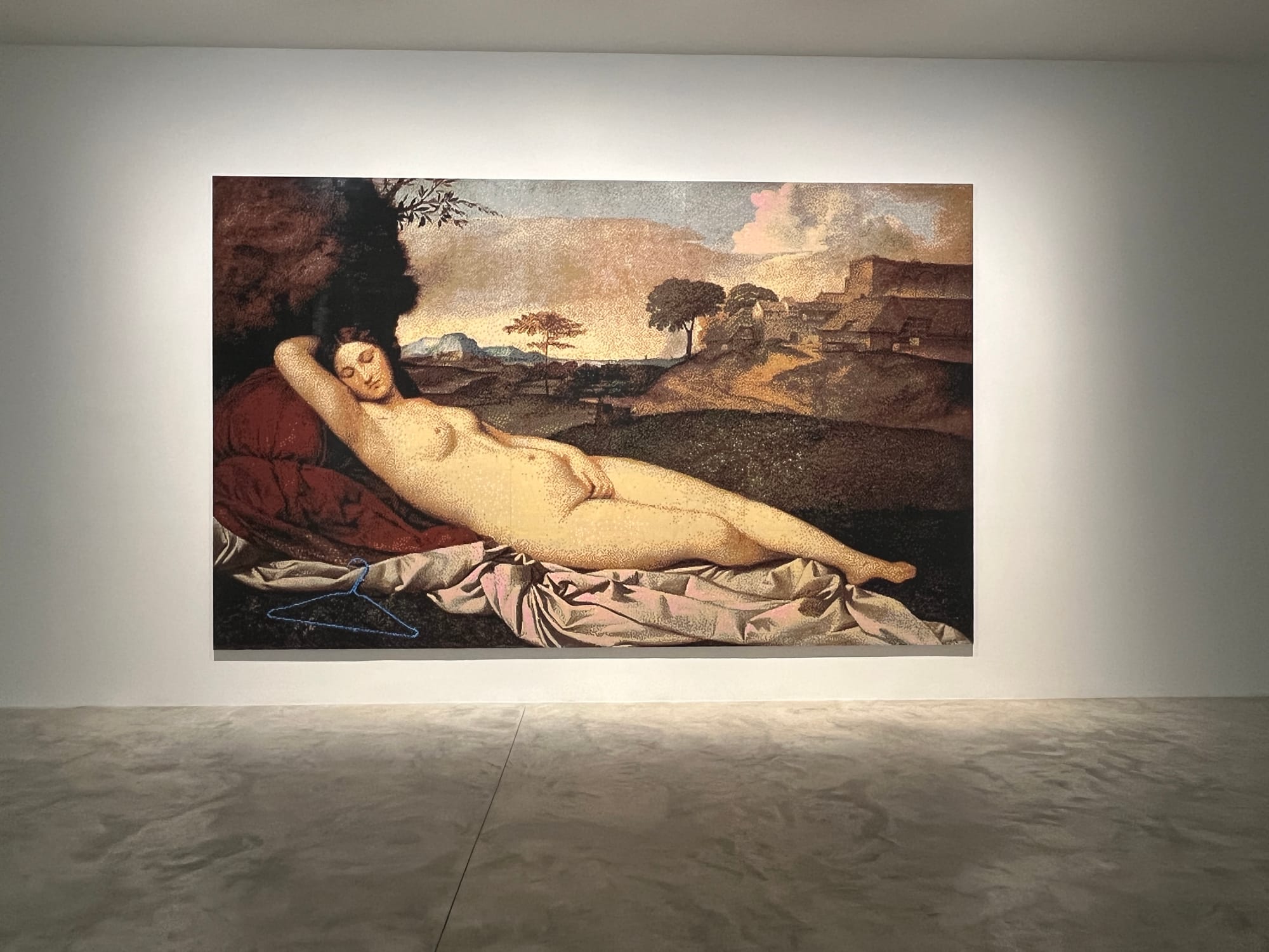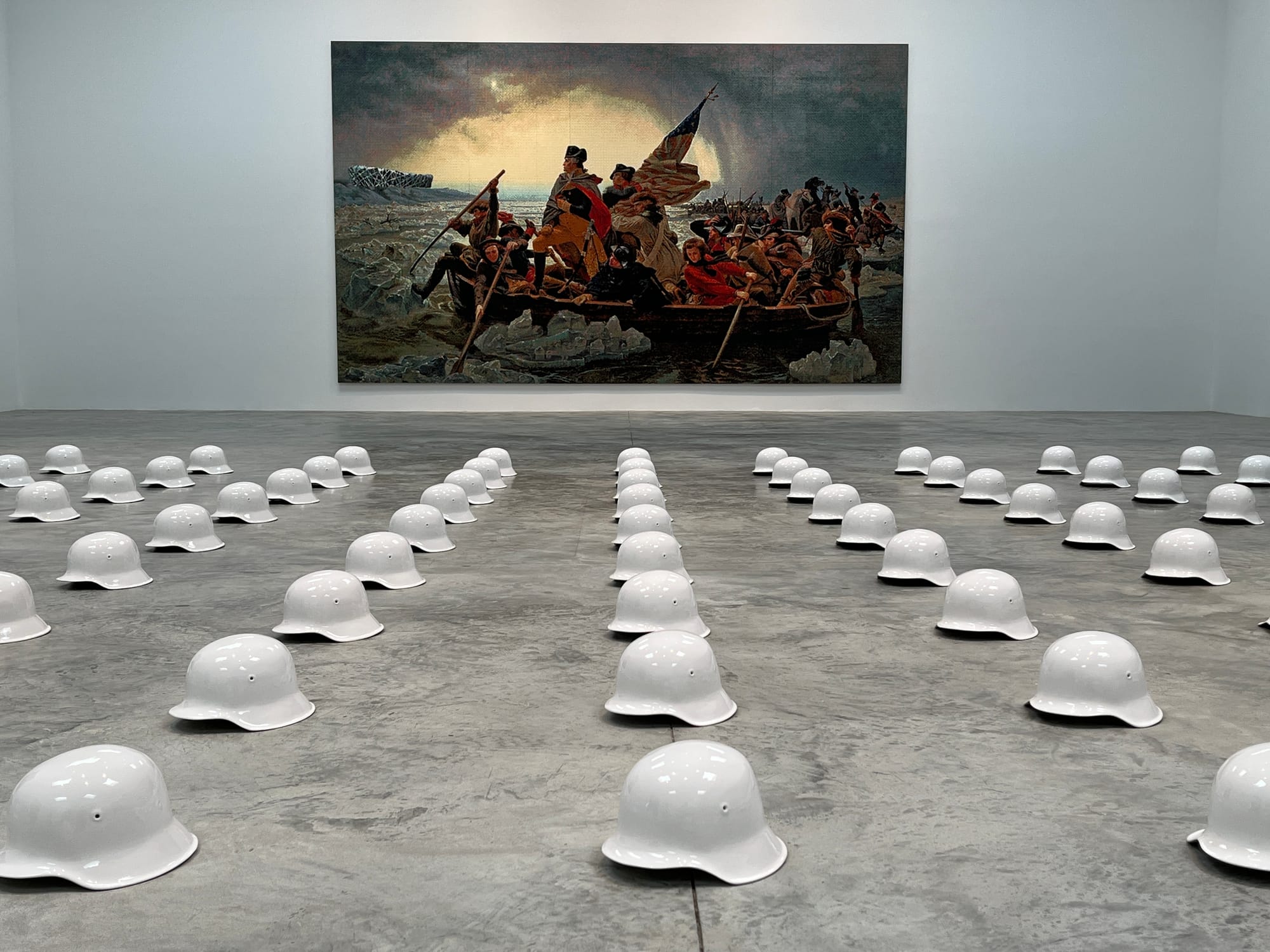 Elsewhere in the exhibition, Ai presents a lineup of familiar Western art historical masterpieces, each with a catch. Emanuel Leutze’s George Washington wades his boat through climate-induced glaciers across the Delaware, while China looms as the world's next hegemon in the background. On the rightmost side of a colossal, 650,000-brick version of Claude Monet’s “Water Lilies,” a mysterious dark void recalls the time spent by both the artist and his father in Chinese gulags and prisons. A Warholian interpretation of Leonardo’s “The Last Supper” (1515–20) features Ai as Judas (“I want to tell people not to trust me,” he told Jane Ursula Harris in an interview published on the gallery's website). Giorgione’s 1510 “Sleeping Venus” slumbers next to a coat hanger used for at-home abortions, and Frank Stella’s 1967 “Harran II” is reimagined with the colors of the Palestinian flag.
