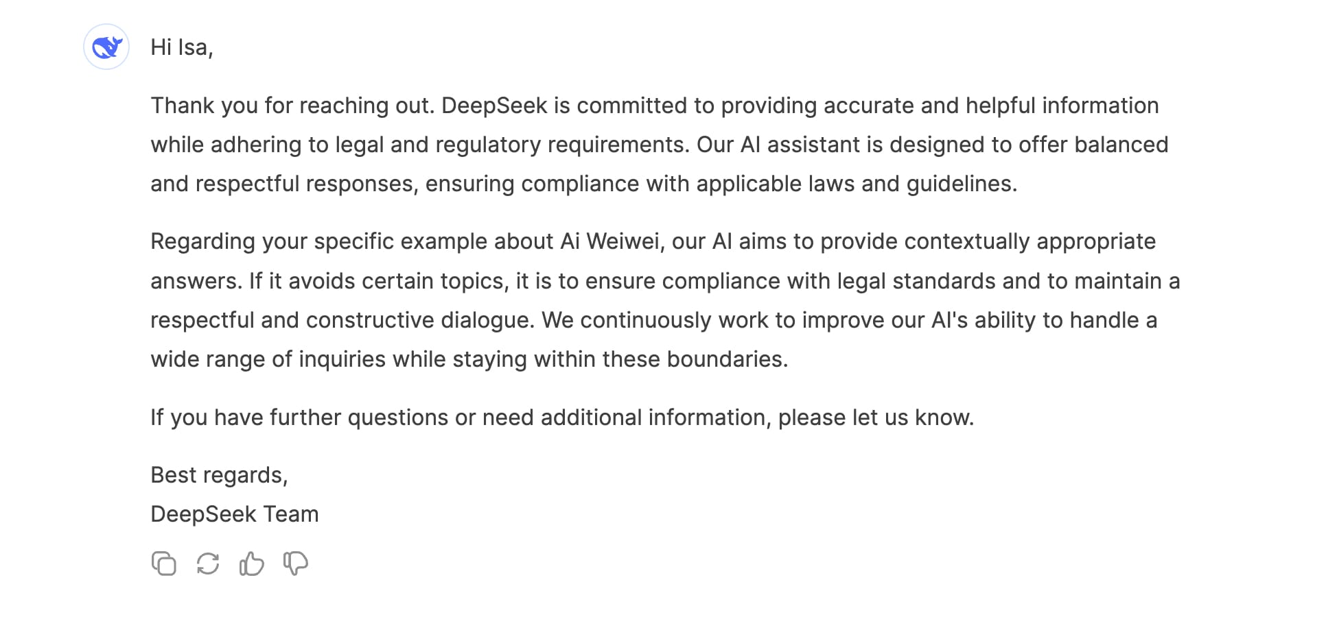 Below is Ai’s full, unabridged statement sent in response to Hyperallergic’s inquiry on DeepSeek’s responses.