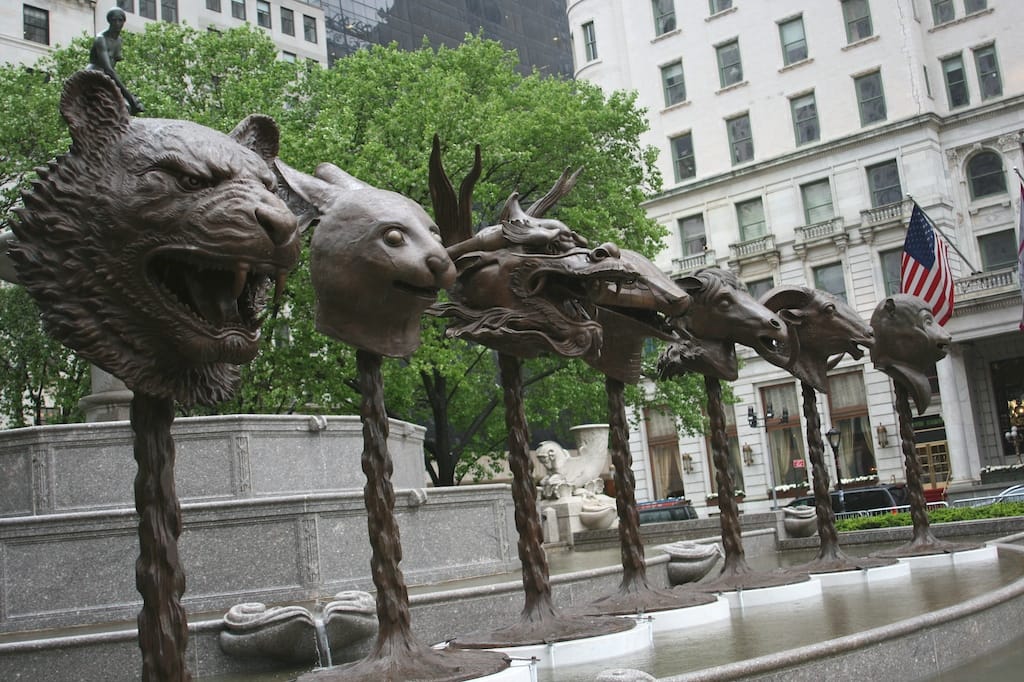 Ai Weiwei’s “Zodiac Heads” in the rain outside of the Plaza Hotel. The sculptures are installed around the Pulitzer Fountain, the first time that art has been installed at the site.