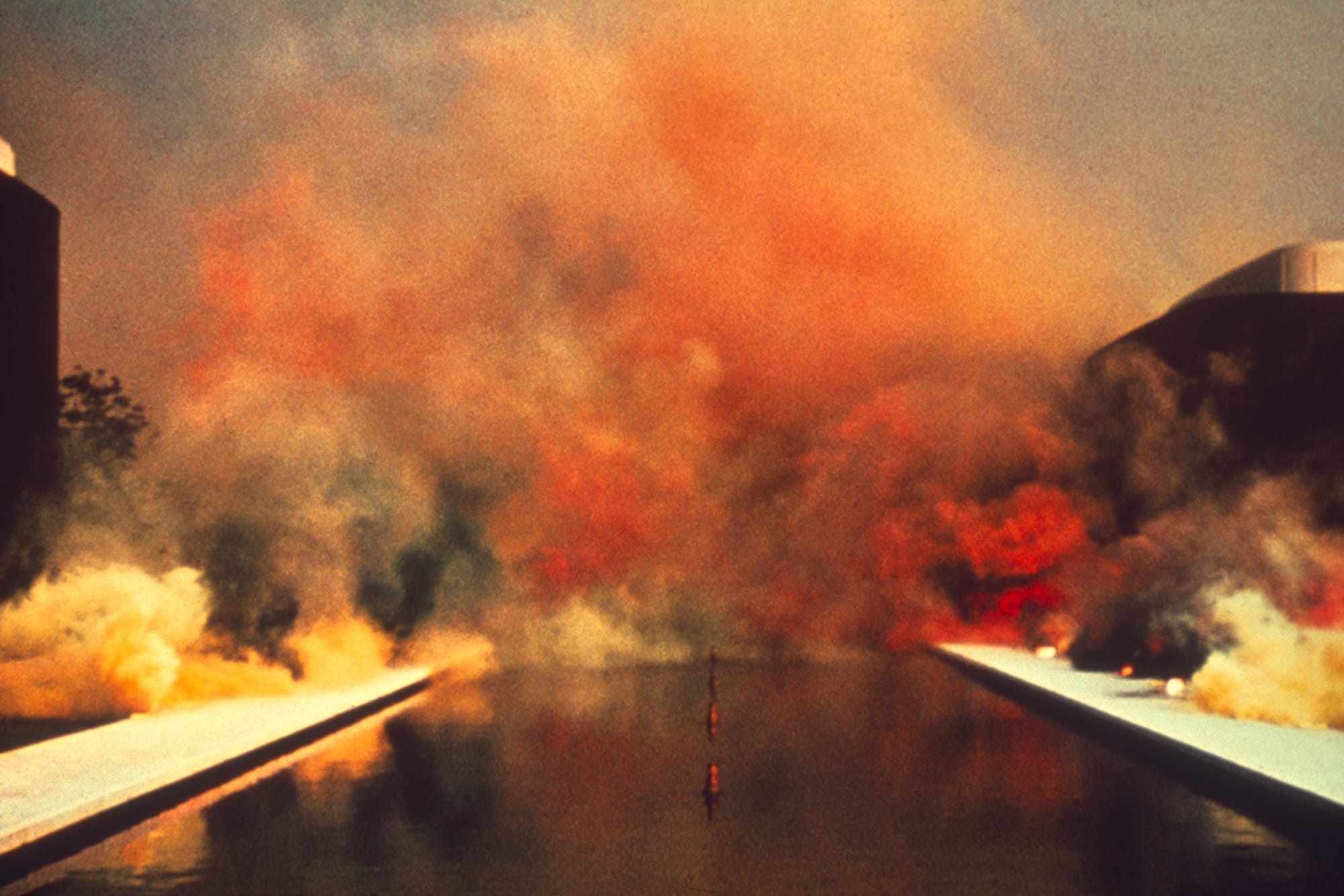 Begun in 1968 in Southern California, the fireworks series features swathes of neon enveloping a desert backdrop, the curvilinear smoke wisping a radical femme erotic through an unforgiving vista. “While the guys were carving up the landscape, I was feminizing it, and softening it,” Chicago recalls, seeing it as a response to the male-dominated field of land art. The shared visual and technological vernacular with the contemporary gender reveal party makes “Atmospheres” feel deeply uncanny and nothing short of ironic from the vantage point of the here and now. The instinct Chicago had to “feminize” the arid terrain as an act of feminist resistance and glitched refusal brought to the fore performative acts that remain to this day incredibly alluring. The material — smoke — intended to take a stance against the destruction of nature toward the production of art. Conversely, artworks produced by male land-art “stars” like Michael Heizer and Robert Smithson often carved into, cut away at, or irreversibly modified the earth. The impermanence of Chicago’s work is incredible to cross reference against today’s reality of over 10,000 acres of scorched earth — gendered “atmospheres” in their own right, performative acts gone entirely awry.