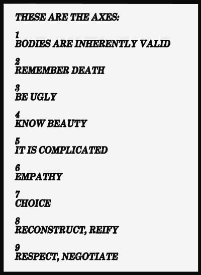 These examples illustrate for us that bodies are social, cultural, and political constructs and capital. Glitch feminism and its manifesto pushes back at gender binary, taking issue with it as a core component of how bodies are built. This aversion to and refusal of the binary is not an argument toward our global transformation into the singular blur of a post-human selfhood. Rather it is intended to challenge us to think more carefully about who the binary project of male / female was built to narrate, support, carry, and protect. Tavia Nyong’o’s exploration of the “non-binary Blackness” in Samuel Delaney’s speculative fiction reminds us that “grounding the politics of non-binary gender in such mundane matters of enfleshment as sex acts and bathroom use remind us how we experience the oppressive norm in our quotidian life.”
