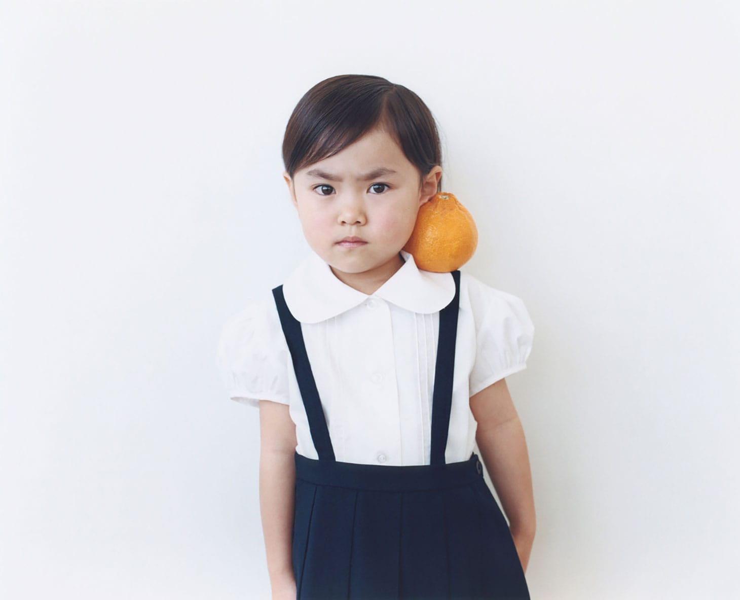 While portraiture is still the genre du jour, the focus on childhood avoided feeling voyeuristic, and created instead an honest probe into the future. Will the next generation be society’s savior, as many current headlines suggest, or are they being damaged beyond repair? Take, for example, the work of Osamu Yokonami, a Japanese photographer who questions what he sees as the homogeneous socialization in Japan, where youthful schoolgirls seem to blend together wearing identical uniforms. Placing them in lush landscapes or forcing awkward, grade school portraits, Yokonami highlights individuality on the cusp of both freedom and oppression. Behind it’s cuteness, his 1,000 Children project, featuring small portraits of uniformed little girls, each balancing a mandarin orange on her shoulder, collectively paints a haunting portrait of fading innocence.
