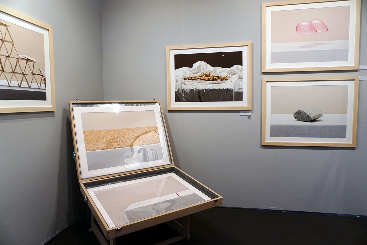 Not many photographers represented ventured beyond of portraiture, but the few galleries that did offered a welcome departure. The work of Polish artist Pawel Zakat Gallery Warsaw takes everyday objects — rocks, balloons, food, nature, cardboard — and turns them into painterly and playful idealizations of the everyday. Pale pink balloons floating perfectly above a pristine white table is a tongue-in-cheek still life, while an ordinary rock or a cardboard house of cards shot with large format resolution play with the idea of absurdist abstraction. The photographs of Mark Lyonat Elizabeth Houston Gallery document empty and abandoned car wash stations, turning them into spaces of contemplation rather than function. Through perspective and geometry, the photographs are both interiors and landscapes, serene and yet watchful, and titles like “Foam and Wash” and “Raging Waters” leave us wondering about the heyday of the car wash.