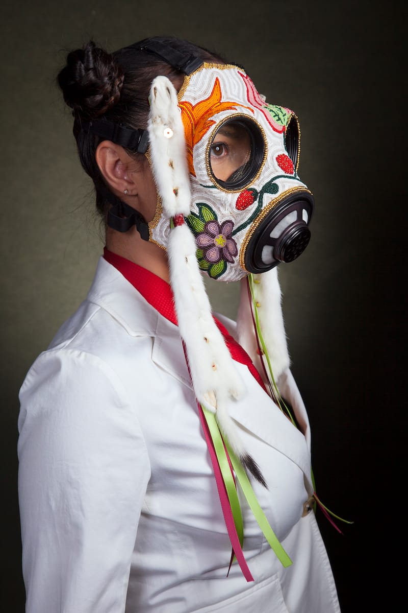Artist Nicholas Galanin interprets air as a tool, a cry for help, and as a stark symbol representing the violence against Indigenous women with the piece “Accessorize with these timeless beauties! Hand-carved Native rape whistle earrings featuring a traditional Tlingit lovebirds design” (2014). Galanin sarcastically glamorizes the rape whistle with beaded embellishments posed for a white-and-ready-to-appropriate audience, touching on both the tragic injustices Indigenous women face and society’s willingness to dismiss it.