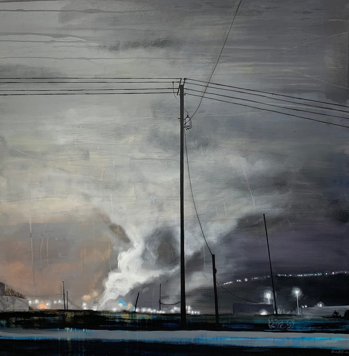 Painter Elizabeth Bunker took a more direct approach in expressing her understanding of the source, creating “View of Refineries from 300 N on January 11th” (2019), a large acrylic painting of the refineries. Eerie, haunting, and almost wet with the steam and smoke billowing out of the pipe towers, Bunker chooses to paint a night in which the Salt Lake inversion was at its worst. While the villainous refineries stand in the forefront, the piece communicates the city’s dependency on fossil fuels by including power lines and the city’s lights in the distance.