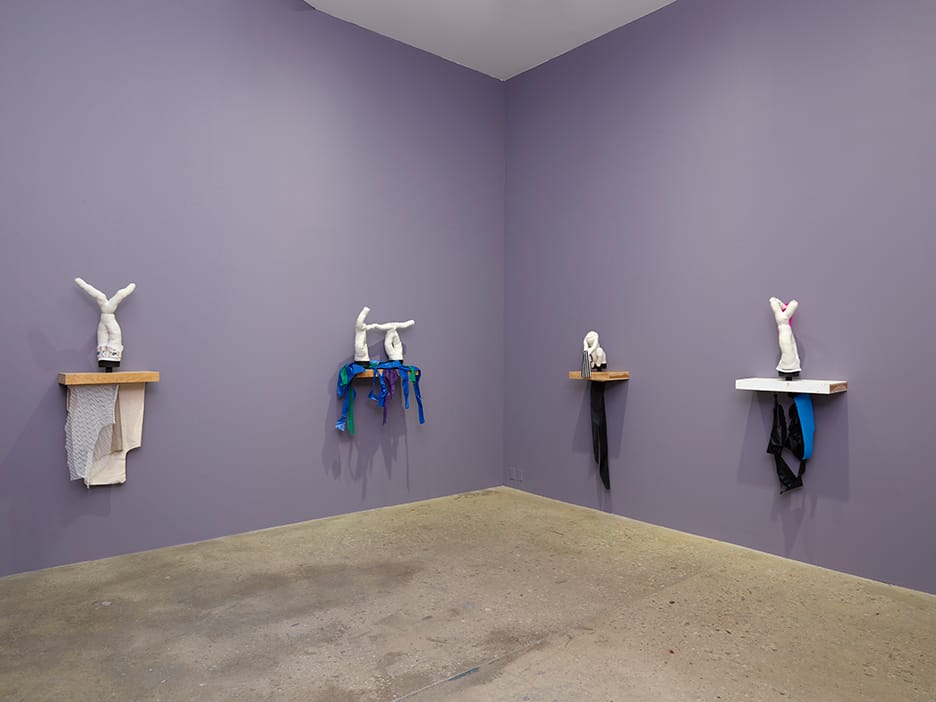 One of the first Bathers encountered upon entering the gallery, “La Baigneur 7 (Teenyelemachus),” stands hunched over with its arms weighed down by a sunset-hued towel as its back ripples with convulsions. The effect is that of a body violently expelling some poison or laughing hysterically. Continuing this emotional paradox across the room, the four figures of “Katabasis” flail and tug at each other with delight or anger.