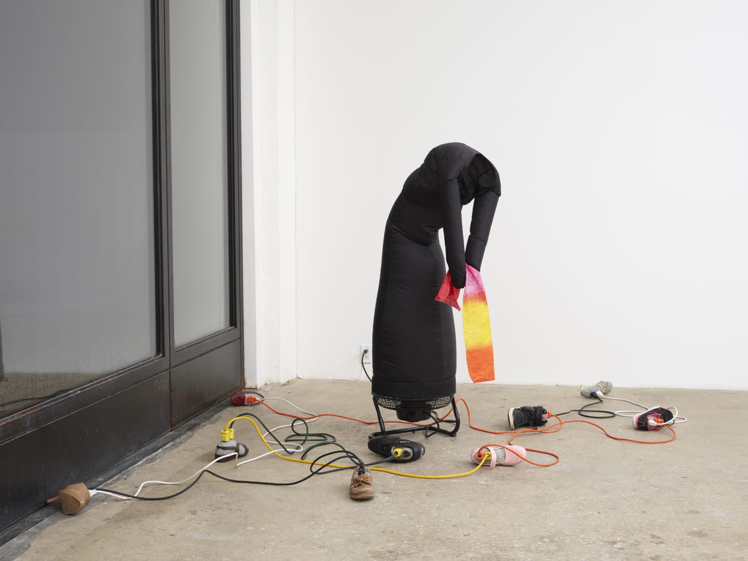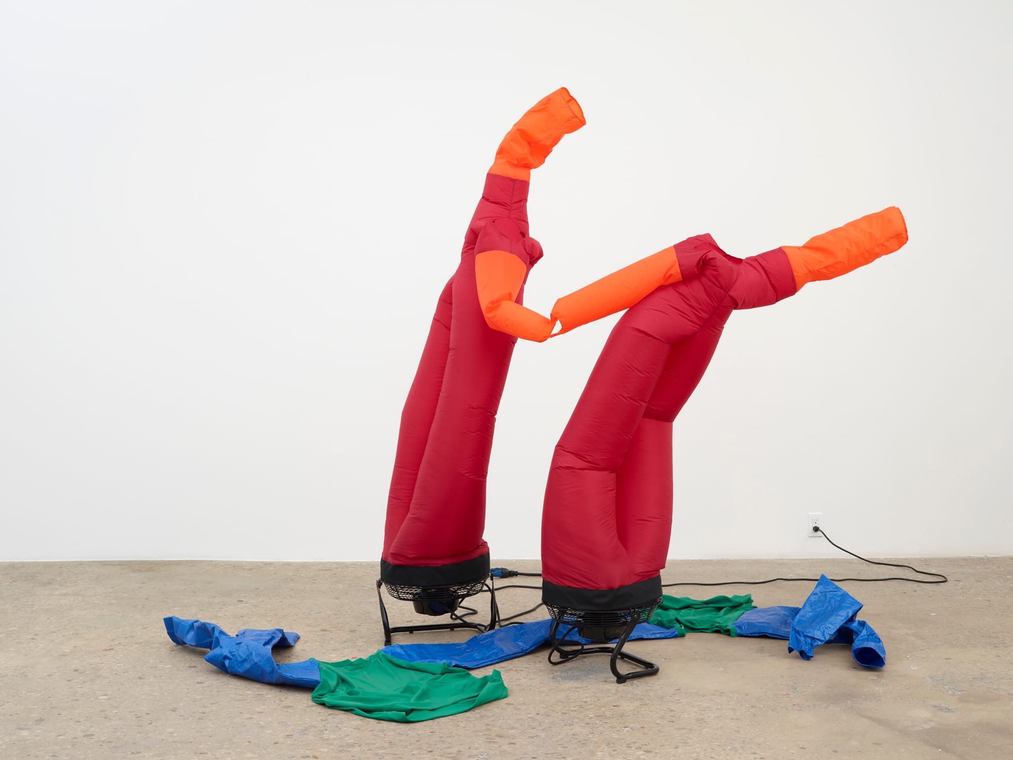 Several sculptures occupy the gallery’s first floor space, some in groups and some alone, all moving. These “Bathers,” as Chan calls them, are an evolution of sky dancers — the wiggly, inflated figures often found at car washes and dealerships — but with added layers of cultural referents and feats of engineering. The vaguely humanoid tubes of synthetic fabric each have a fan at their base, pointed upwards, enabling their pneumatic performance. Chan carefully manipulates the fabric’s construction and blown air to produce the illusion of much greater mass, animated with expressions of anxiety, camaraderie, and fatigue. I was surprised by how quickly I imprinted on the Bathers. The emotions I projected onto their movements inundated my body and sense of weight — as though the atmospheric pressure was fluctuating as I walked through the rooms.
