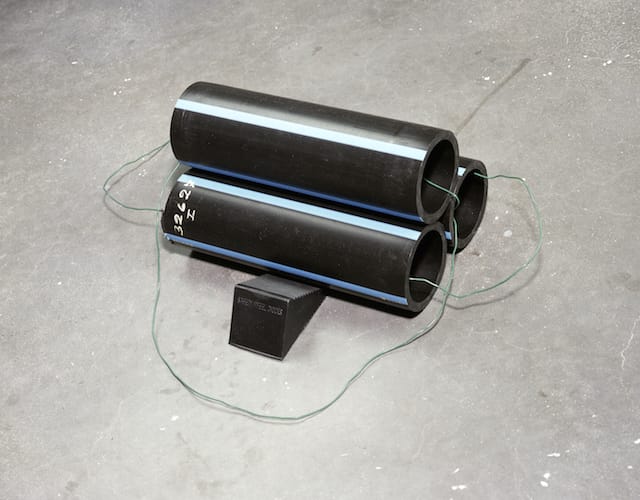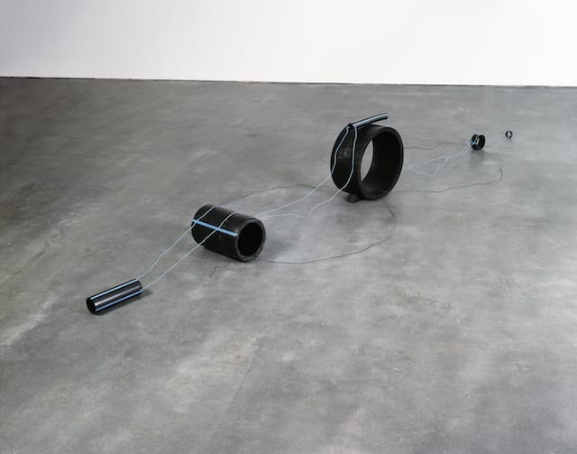 Living a few blocks away from the World Trade Center in the early 1990s, he witnessed the aftermath of the truck bombing that took place on February 26, 1993. He also read all the reports. Placed a few feet away from the sculptures, “Full Gospel Neckless (Dog Walk)” and “Full Gospel Neckless (Dog Act)”, “Full Gospel Neckless (Pipe Bomb) (all dated 1997) taps into the necessary vigilance that has taken up a large space in our urban consciousness: “If you see something, say something.” But even in the face of such vigilance, Taylor never loses his sense of humor, never devolves into self-importance or posturing. By spacing out different-sized pipes, from small to large, in “Full Gospel Neckless (Dog Act)” so that they form a series of tunnels and platforms, and looping smaller sections of pipe to the top of wider ones, Taylor is able to evoke a tawdry circus routine. You don’t have to see the dogs to know how fruitless their lives are, the pipes and wire tell you everything you need to know. They just repeat the same act over and over, to the delight of others. Perhaps we too are like those dogs, always performing. What comes across in these works is futility and humor, in equal, inseparable doses.