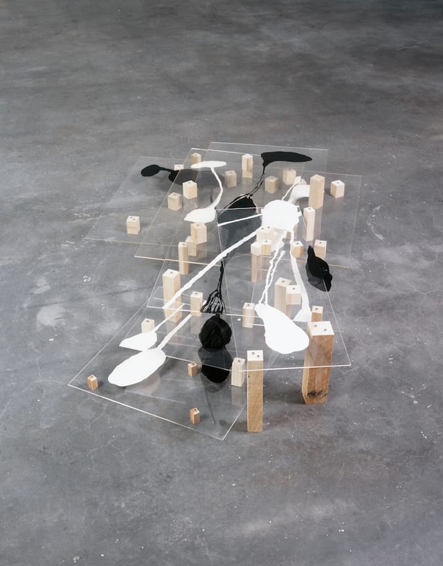 In the “puddle” sculptures, Taylor used Plexiglas, enamel, paint and wood to construct multi-tiered, transparent pieces on which he poured either white or black lines and pools of paint. There is something impish about making a sculpture about dog pee, because the owner has to bring the artwork inside. The tilted angles of the Plexiglas suggested that this could be some strange, high school science experiment about measuring gravity and the flow of liquids. Using the plainest materials — not sheet metal or bronze — he also exposed the Minimalists and the Neo-Expressionists for their reliance on expensive materials. I think the art world just doesn’t want to deal with Taylor’s deadpan humor, because it reveals its foibles, pretentiousness and chest-thumping histrionics.