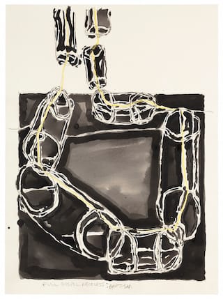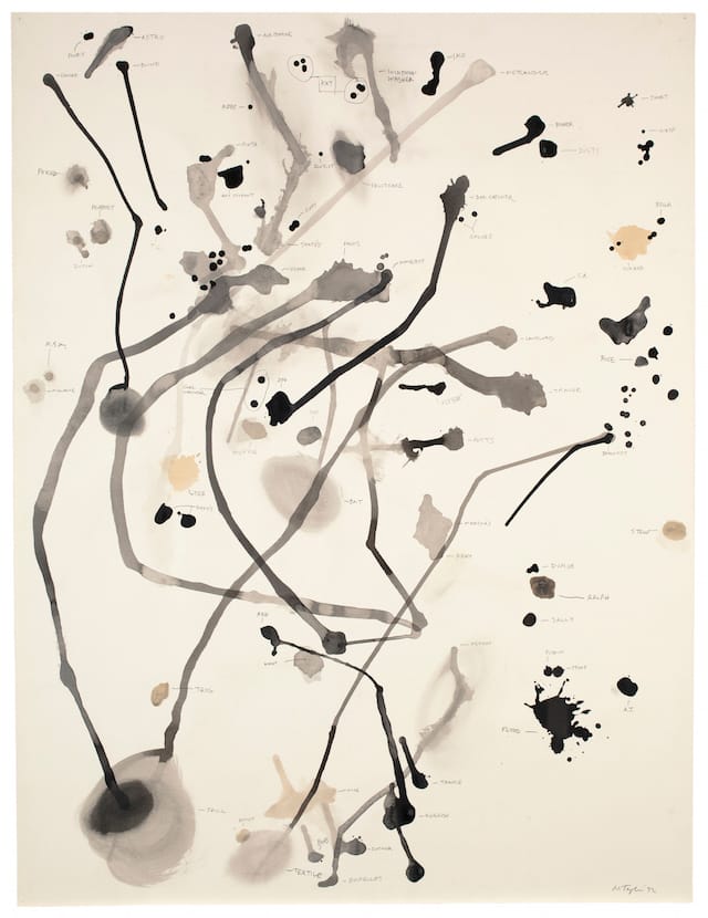 In the four numbered drawings from the series The Peabody Group (all dated 1992), with the title obviously a pun, Taylor used gouache, ink and tea to make a tangled field of stained lines, ranging from umber to black. He names each one. One of the names, “Bornemisza,” stuck in my head, because it likely alludes to the wealthy collector, Hans Heinrich Thyssen-Bornemisza. It is as if Taylor is mapping the pee stains left by various dogs, as well as satirizing stain painting and the belief that art can achieve some kind of aesthetic purity. By focusing on waste matter, he reminds us that an artist may ignore the cycle of consumption and waste that is central to all human behavior, from the individual to society, but ultimately cannot escape it. Furthermore, he has deflated the art world’s touting of the indexical by focusing on an absurd task. And yet, for all the satiric humor, there is something forlorn and bizarre about mapping pee stains and dutifully recording which dog made each mark. It is this Kafkaesque aspect of the work that gives it a deeper emotional dimension.
