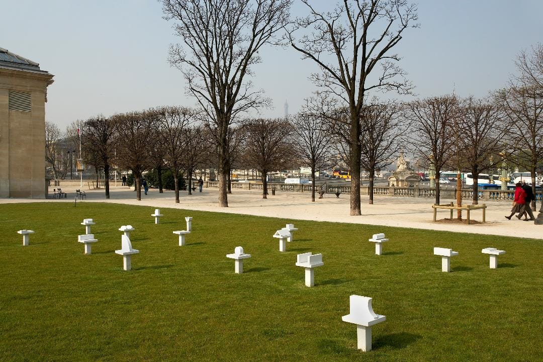 In 2007, the Musée de l’Orangerie in Paris invited Kirili to show drawings and sculptures in the company of paintings from Claude Monet’s Les Nymphéas (Waterlillies) sequence. As Kirili has noted, these late Waterlily compositions are “open, without beginning or end.” In sympathy with this implication of the infinite, he built a variation on his Commandment series. First launched in the 1970s, a cluster of totemic forms occupies the gallery floor in each previous iteration; low-lying, their proportions and hieratic configurations nonetheless give them a monumental aura. Subtitled Homage to Claude Monet, this multi-part sculpture was installed on the banks of a pond near the Orangerie. Made of tinted concrete, its play of colors alludes to the color that flickers over the surface of the pond — and through the art of Monet.