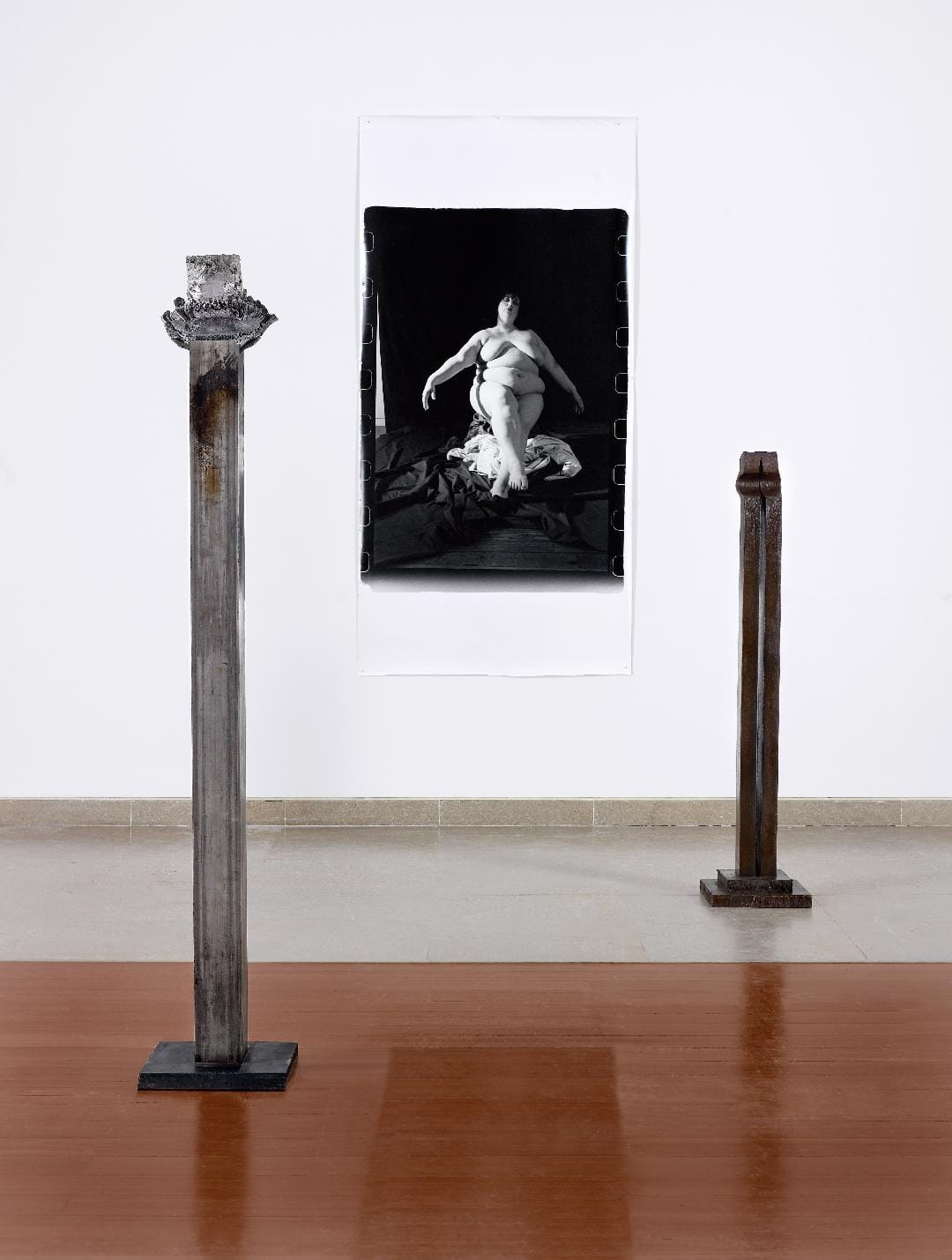 Forging, welding, cutting, hammering sheets and bars of metal, bending wire, and molding terra cotta — with each of these processes, Kirili finds in inanimate matter a metaphor for flesh. Weighty or delicate, his objects have a commanding bodily presence and that is why his three-dimensional works interact so tellingly with Lopez-Huici’s photographs, for among her most frequent subjects are heavy, at times obese, nude women unabashedly assuming the poses that have long been used to reinforce conventional standards of feminine beauty. Rejecting stereotypes that align physical beauty with slimness, Lopez-Huici’s models powerfully assert their beauty.
