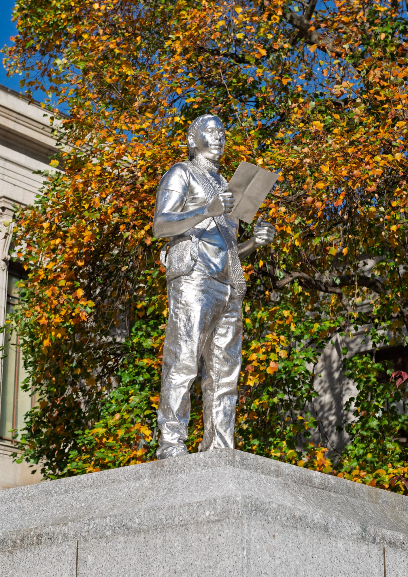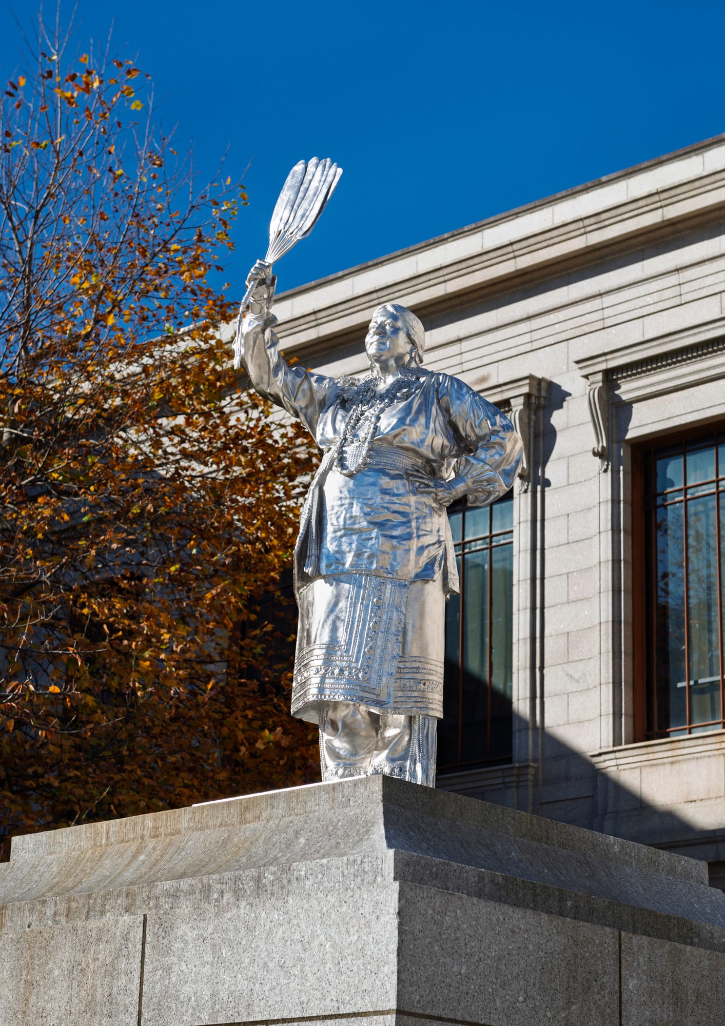 Last year, after four decades of reconnection with his Indigenous community, deep historical research, and the development of a highly acclaimed practice in video, installation, and public art, Michelson returned to the MFA to install his answer to the 1908 sculpture: two platinum-gilded bronze sculptures of living Native leaders who are Indigenous to the land now known as Boston. The gleaming forms of Aquinnah Wampanoag artist and activist Julia Marden and Nipmuc artist Andre StrongBearHeart Gaines Jr. stand proudly on the two large plinths on either side of the MFA’s entrance, resolutely toppling the myth that Indigenous peoples have disappeared from this land and honoring the vitality of Native communities today.