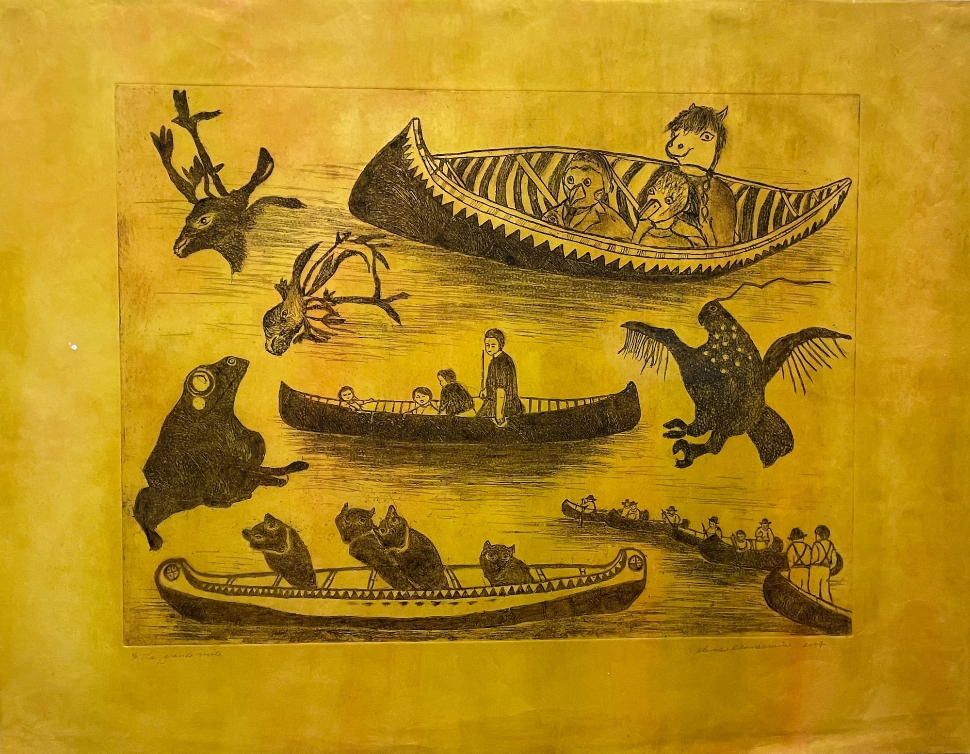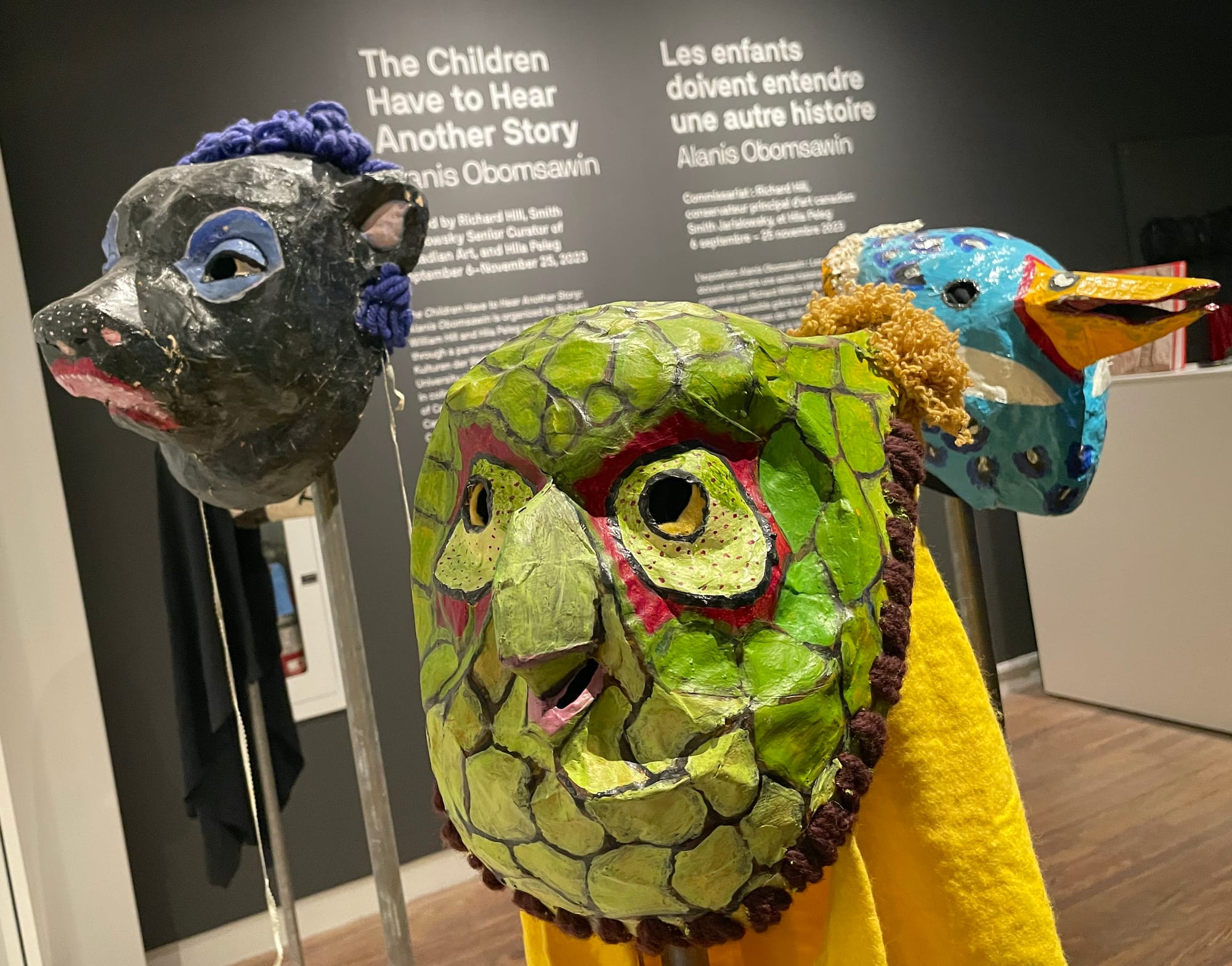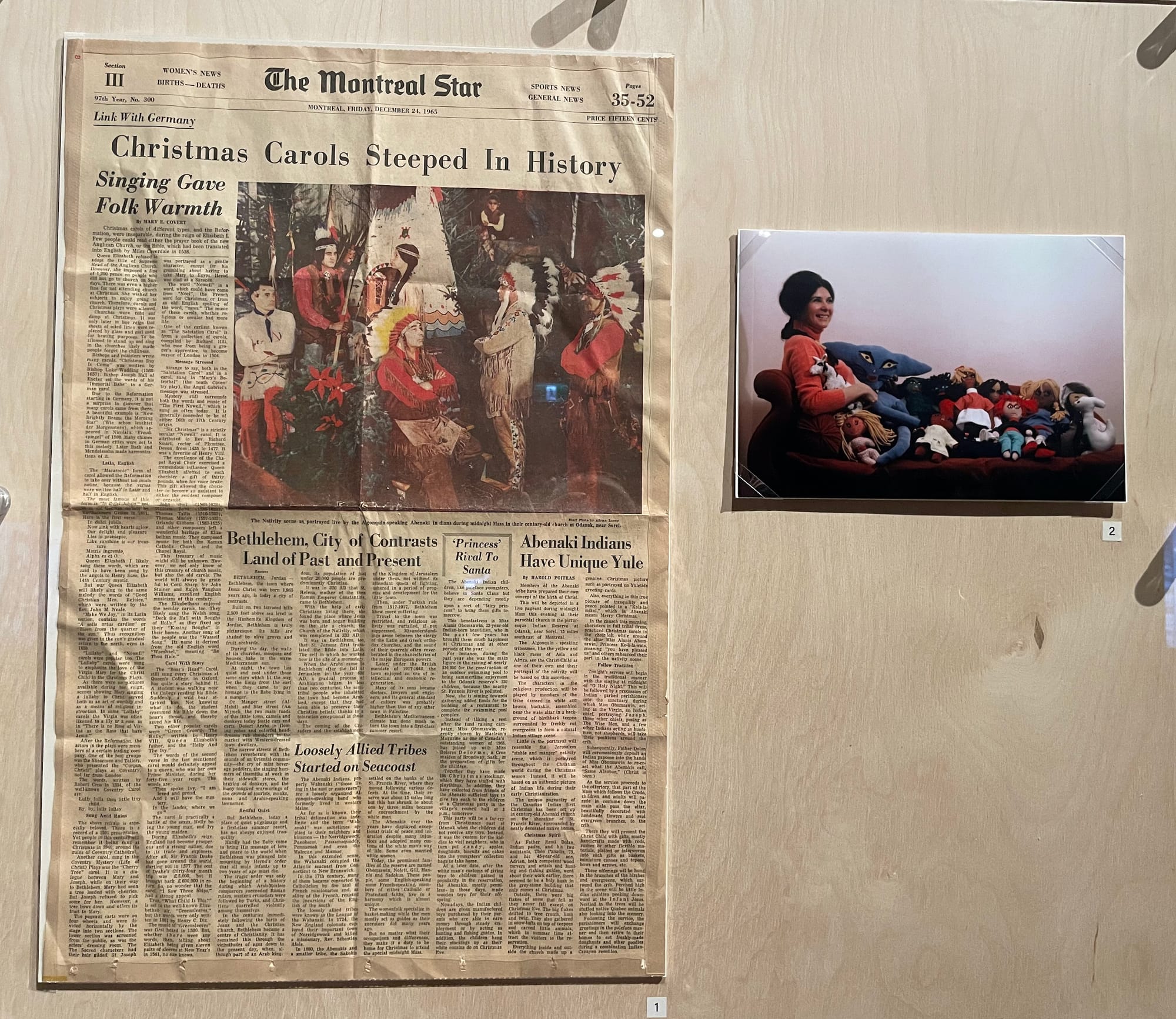 As the title indicates, the show begins with children and education. Animal masks greet visitors at the gallery’s front window; nearby, two of the artist’s handmade stuffed animals sit on a comfy chair near a 1963 news story about Abenaki Christmas traditions. As her practice matured in the ensuing decades, Obomsawin’s films and artworks began to move between and weave together youth education and adult calls to action, resulting in a body of work that speaks to multiple ages and generations.