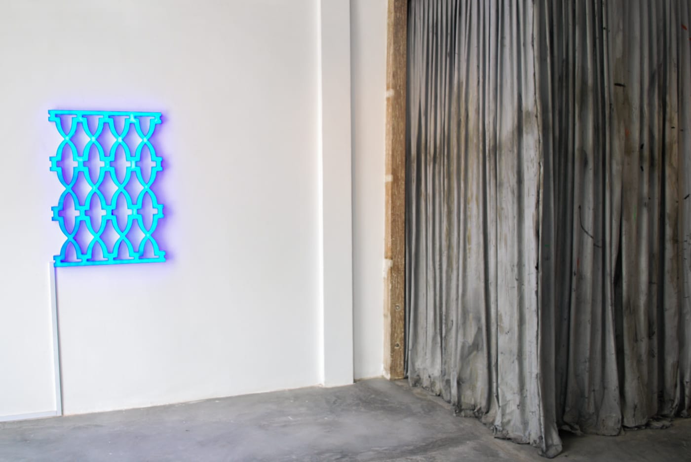 Similarly, “Vision A Reality (Wat Ounalom)” (2017) — visually the most beautiful piece in the show — is a replica of a window grate from nearby Wat Ounalom, which houses an archive Samreth used to frequent. The smooth, acrylic sculpture glows blue with hidden LEDs, revealing an afterimage of the original design. The piece is perfectly complemented by the gallery’s window grates, which are themselves copies of a villa designed by Vann Molyvann, the starchitect of NKA.