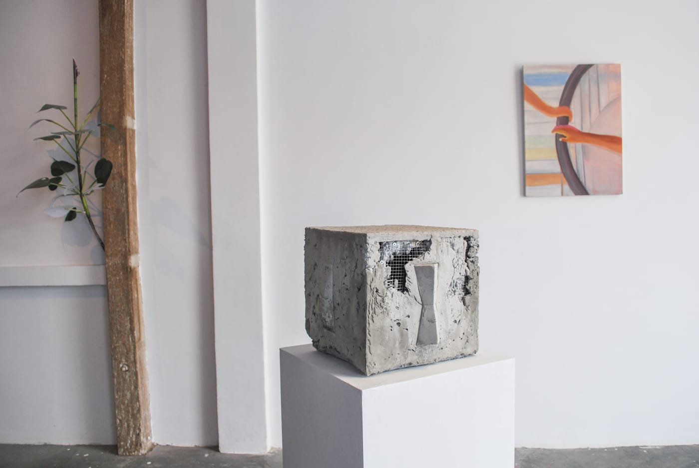 The exhibition, made into a fashionable and modern living room, begins to pick at the edges of this history. NKA was modernist architecture without modernization; the buildings hinted at the Angkorian empire, but it was centuries gone. These oppositions are most clearly embodied by “Memory Object 1” (2017), an awkward cement cube, with suggestions of design elements from the villas around Phnom Penh. The quality of the object is such that we are unsure if it is being torn apart or repaired — whether it’s a remnant or a model to be built from. This is a lingering feeling throughout the city.