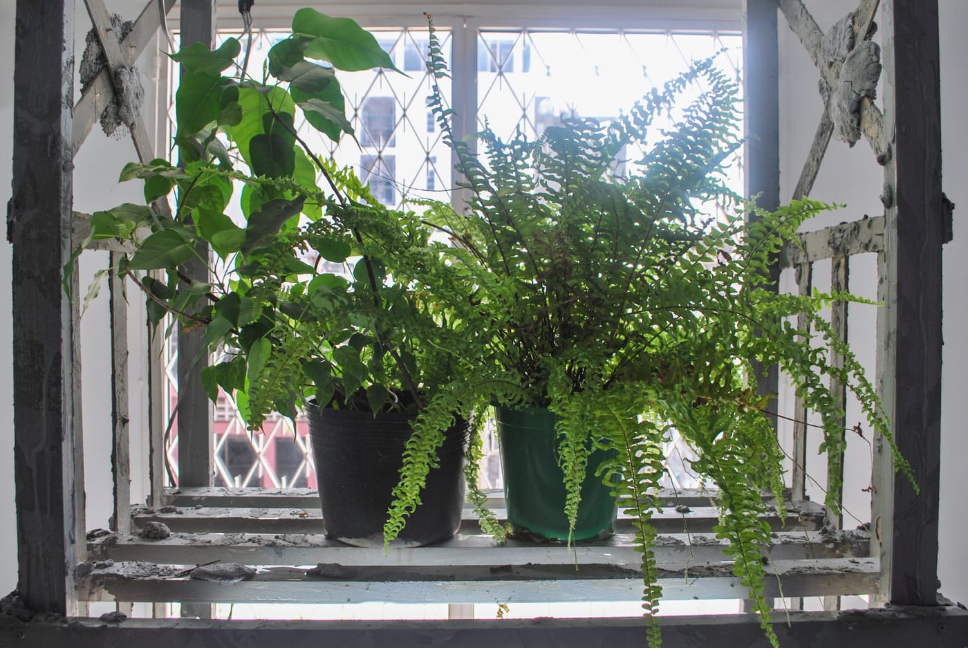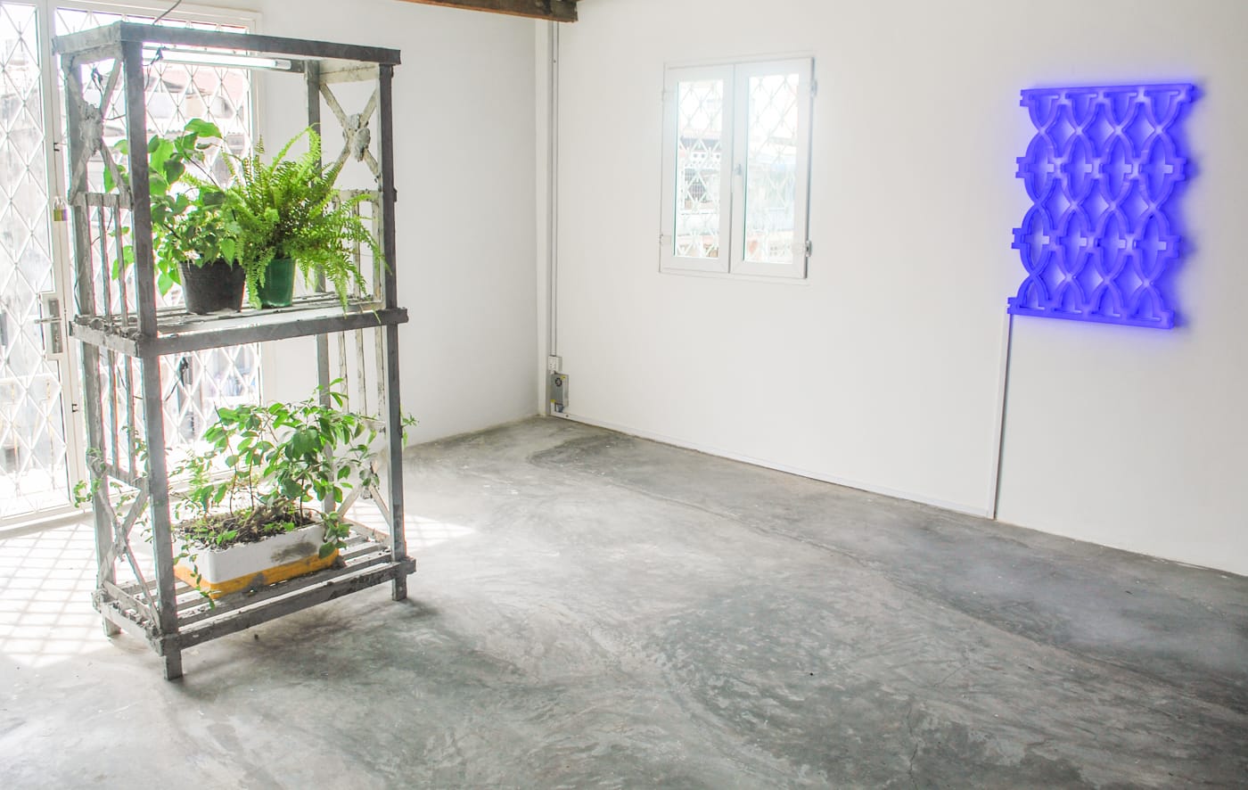 The New Khmer Architecture becomes a means to explore memory, especially of Phnom Penh. The exhibition privileges the perspective of objects — which have experienced, endured, and carried the passing of time — and calls into question the tools we use to remember and document. In the video “One Lightyear on Earth” (2017) we find Samreth wandering the city, searching for Phnom Penh’s identity, but finding nothing but confused memories leaning into the present, tangled with ghosts. In “Materials for Archive” (2017), Samreth has replicated a shelf from the National Archive, with fluorescent tubes growing plants taken from the White Building right before its demolition. The documents are gone, the shelf is the archive, preserving only overgrowth from the White Building, which had been evolving into something else entirely. As “One Lightyear on Earth” says, “in Cambodia nature is always making its way in.”