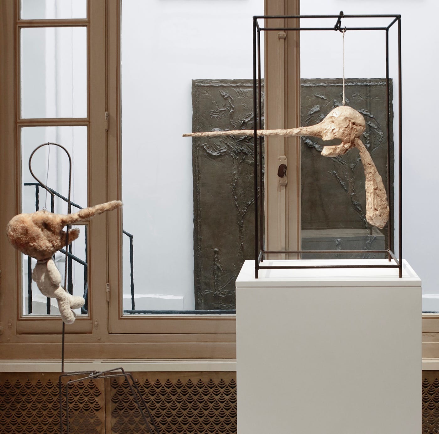 PARIS — Desolate by design, the spindly sculptures and plagued portraits created by Alberto Giacometti last century receive a refreshing reinvigoration by Annette Messager in her delightfully dialectical two-person show titled Our Rooms. This small but striking cross-gender and cross-generational show successfully pairs the artists’ work together at the new, intimate, Giacometti Institute in Montparnasse. Established this summer, it preserves, behind glass, the artist’s dusty, cluttered studio that was once nearby on rue Hippolyte-Maindron. (The original building there no longer exists.)