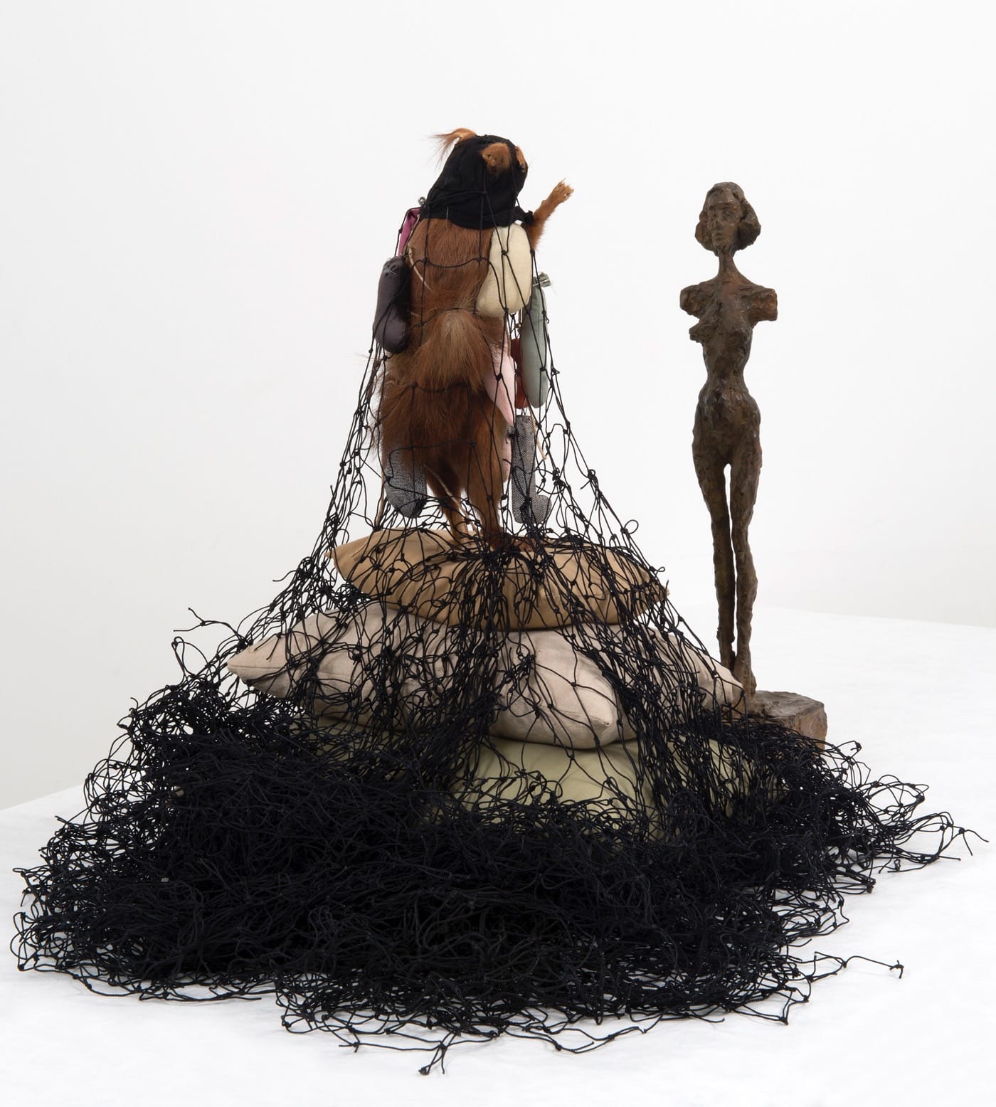 The first stand-alone piece seen is Giacometti’s small “Figurine in Cage” (1950) which leads to Messager’s arranged room of encounters, dedicated to Giacometti’s entourage. Displayed are splendid photographs, letters, notebooks and drawings, most notably one of his mother Annette, “Head of Mother and Man” (circa 1963). It is then I realized the neat conceit at work here: Annette is the name of Giacometti’s mother, also Annette Arm, his wife and primary female model, as seen in “Standing Nude (Annette)” (1961), and also of Messager who is tenderly pairing herself with him here. Indeed, the strongest, strangest, and most surreptitious thing in the show is “The Parade of the Squirrel for Annette” (2018), Messager’s arrangement of Giacometti’s “Annette Standing” (ca. 1954) and her “The Parade of the Squirrel” (1994). There is magic afoot.