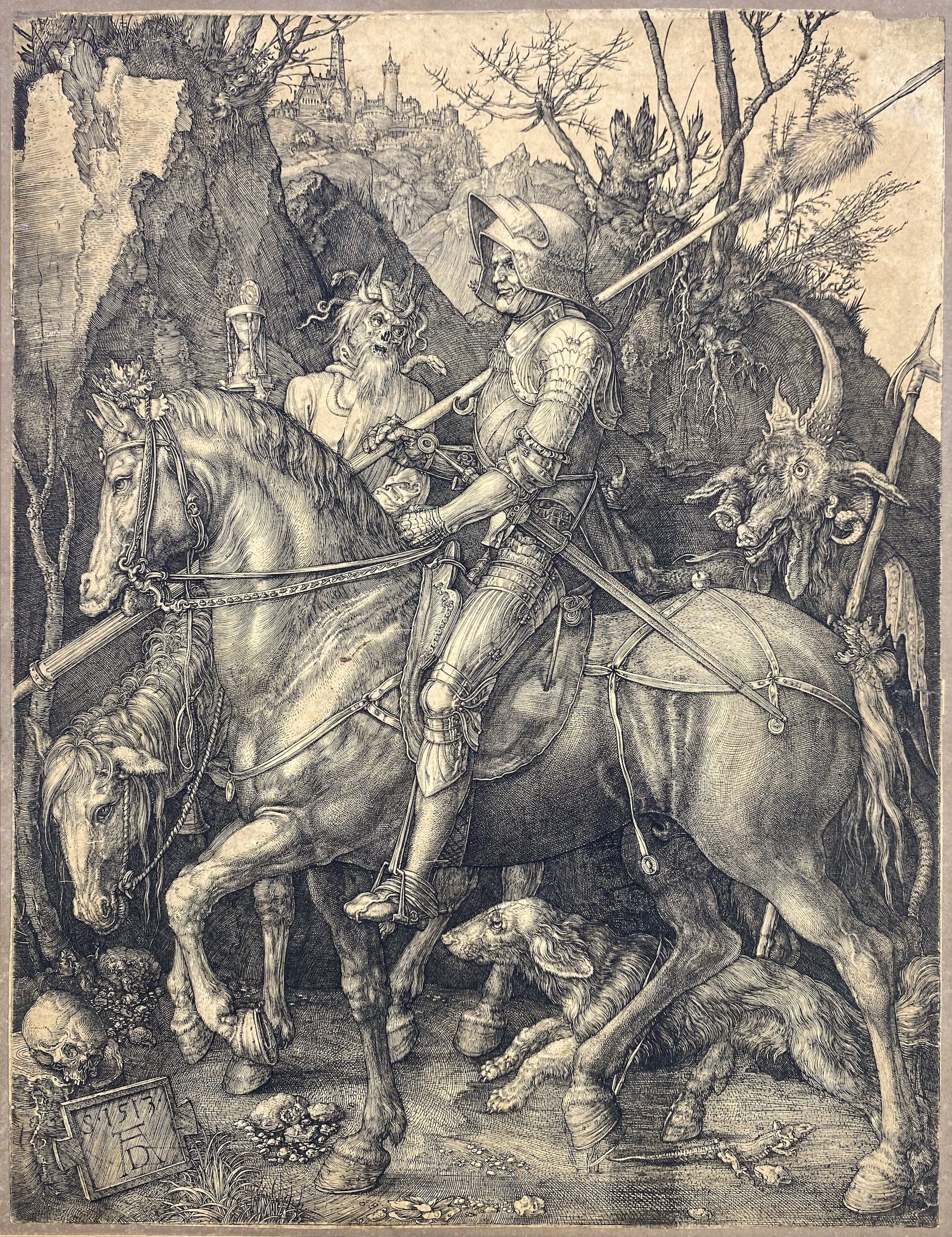 “Knight, Death and the Devil” is one of three of Dürer’s master engravings, which follow similar theological and moral throughlines. This particular work features a knight riding a horse as a devil caricature holding an hourglass, thought to be a reminder of how short life is.