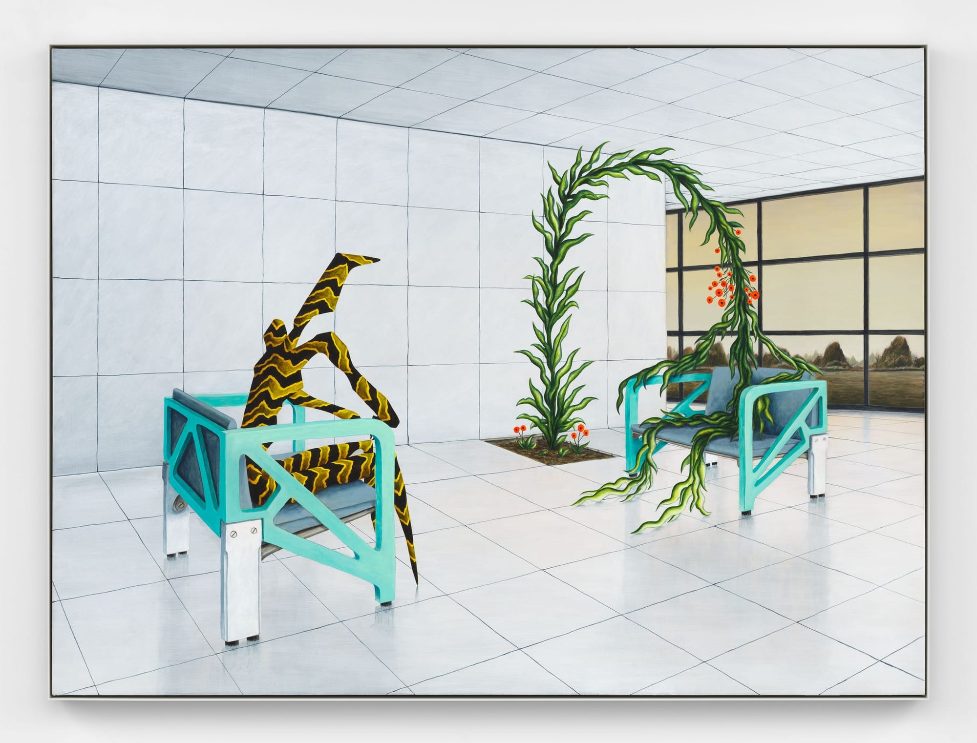 The ethereal quality of the Red Room emanates throughout nearly every artwork in ALEXANDRIA, Alejandro Cardenas’s first solo show with Almine Rech. The artist created each piece in this presentation amidst the ravage of the pandemic and wildfires that engulfed Los Angeles in 2020, and it shows. From prophetic apricot skies, to barren spaces and isolated characters, the allusions in this exhibit all feel like simulacra of the moment.