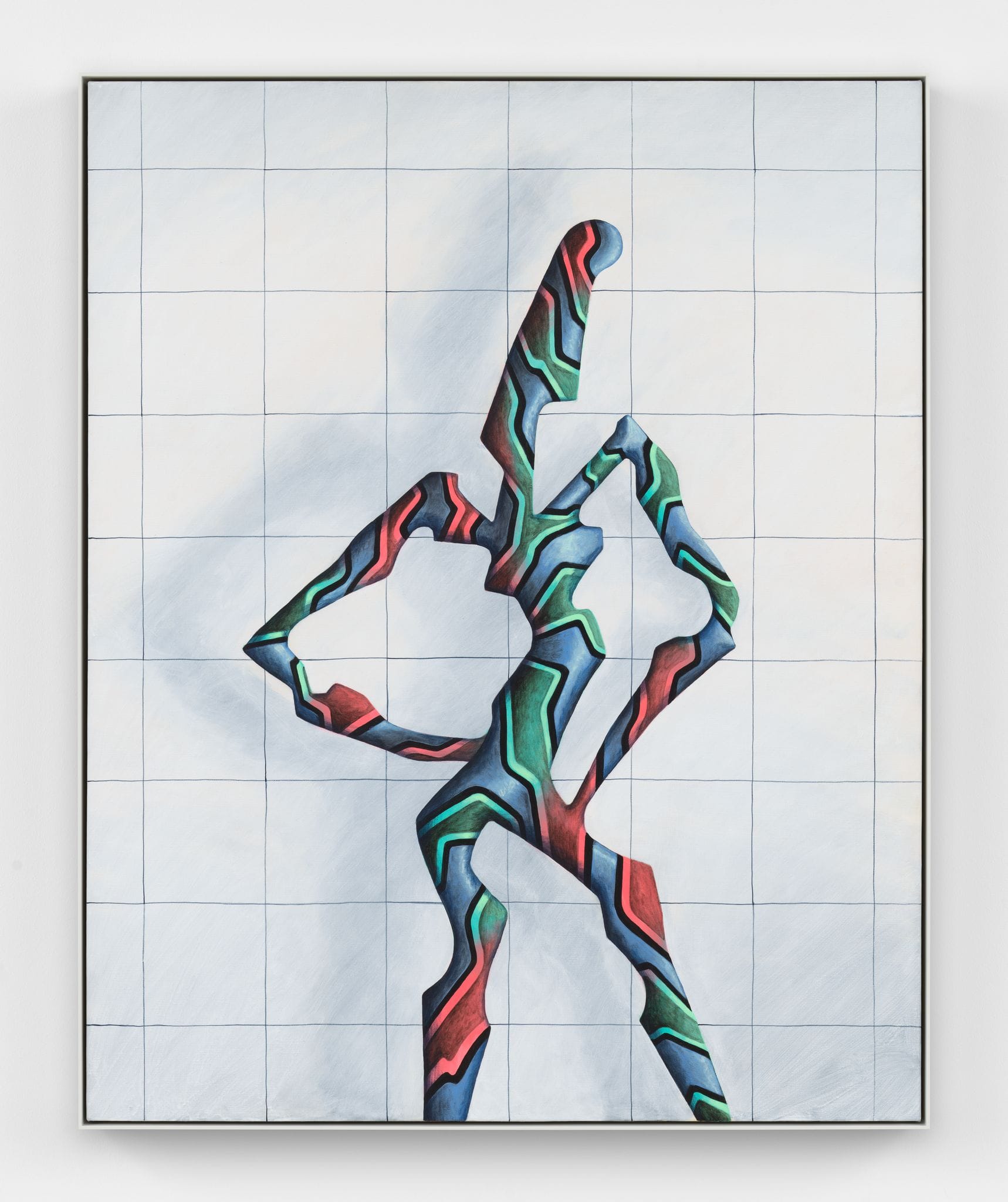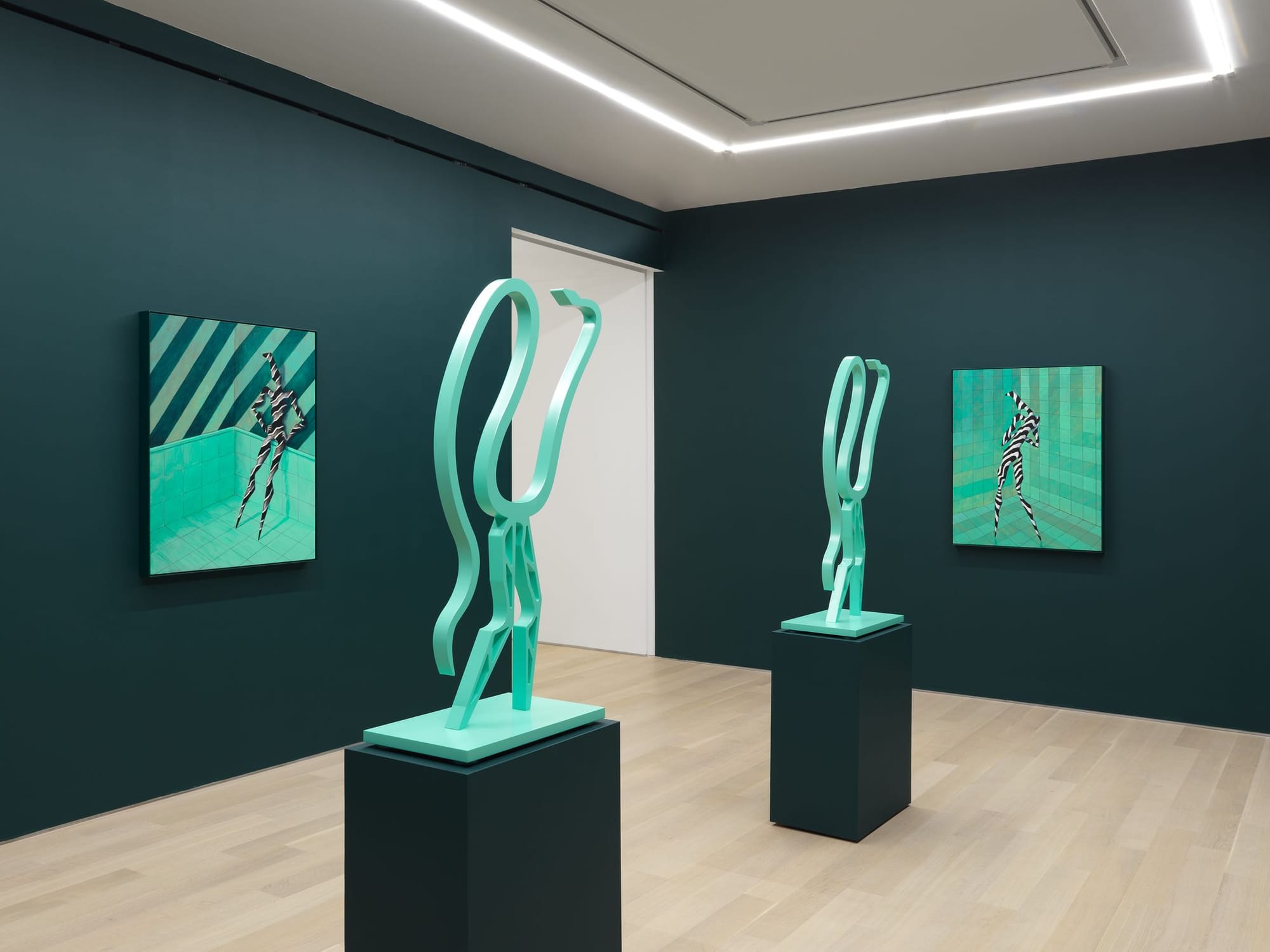 The artist’s claymation-like humanoids are faceless, but affecting: in “If this were to continue” (2020), a creature painted violet and chartreuse bears down on the floor across from its brooding cyan and copper counterpart. These characters’ body language emotes the exasperation of a harrowing breakup, or perhaps a natural disaster. In “If it strikes” (2020), a pastel figure cocks its hips left as if posing in a Spring/Summer 2021 show. What these characters lack in grins and scowls, they make up for in gestures. Standing in their company, I’m immediately reminded of the bodily hyperbole required to show affection while wearing a mask. Bright stripes and zigzags allow the personalities in these paintings to pop against their sprawling environments, telegraphing both impressive depth and intense seclusion. Perhaps that’s why the sculptures in this show, “Continuous Sentry and Sea Krait” (2021) and “Sea Krait Gerwalk mode” (2021) — hollow silhouettes that perch in the middle of each wing of the gallery — don’t elicit the same intrigue as the acrylics.