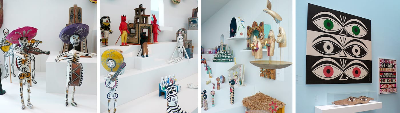 Even after the Girards made their last big move, in 1953, to Santa Fe, New Mexico, where they renovated an old adobe house and reveled in the big skies, colors, textures and native cultures of their new surroundings, Alexander maintained close ties with his corporate clients and contacts back east. He had room to display his beloved collection of folk art from around the world, which served him throughout his career as a powerful source of inspiration. In Mexican Day of the Dead papier mâché statuettes, Japanese kokeshi (painted wooden dolls), Hopi beadwork figures, puppet theaters, and many other varieties of folk art, Girard found the same synthesis of color and expressive form that he brought to his own modernist work. (Later he donated his collection of more than 100,000 objects to the Museum of International Folk Art in Santa Fe, where it remains on permanent display).