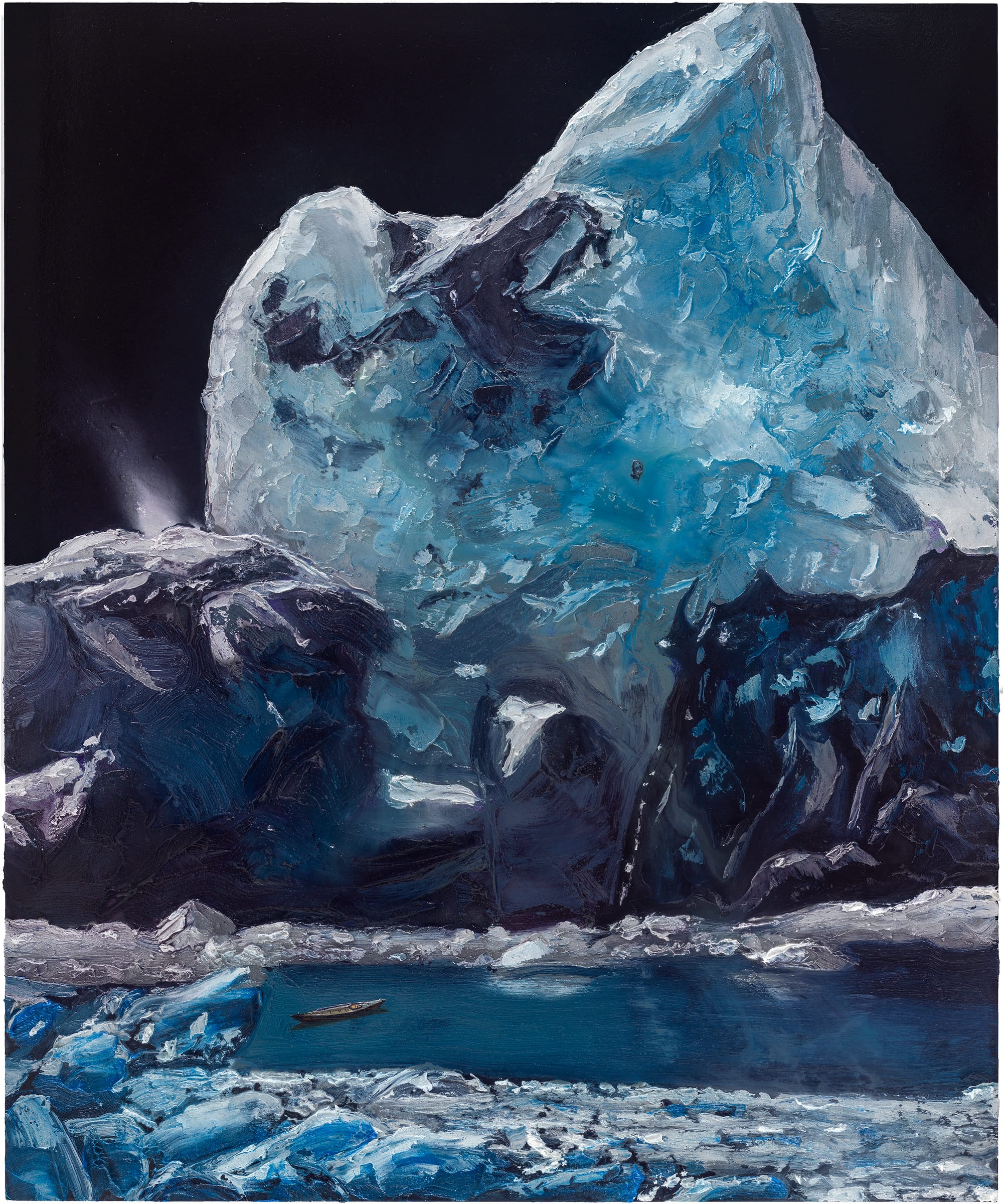 Rockman has painted a sublime arctic landscape before — the gargantuan “South” (2008), which spans almost 30 feet in length across seven pieces of gessoed paper — but the artist typically works in a surreal, almost comic register. The majority of his acclaimed landscapes imagine fantastical eco-dystopian futures, with cross-sectional above-and-below–water compositions that resemble certain natural history museum dioramas, in which exotic animals teem amid the ruins of human civilization. Melancolia’s glacier paintings, in contrast, offer no glimpses of what lies beneath the water’s surface and are almost devoid of human or animal presence, with even the crashing ships rendered invisible behind clouds of kicked up snow. A small lone kayak occasionally dots the paintings’ foreground waters, the kind of detail sometimes present in Hudson River School paintings to convey the grandeur of nature’s scale.