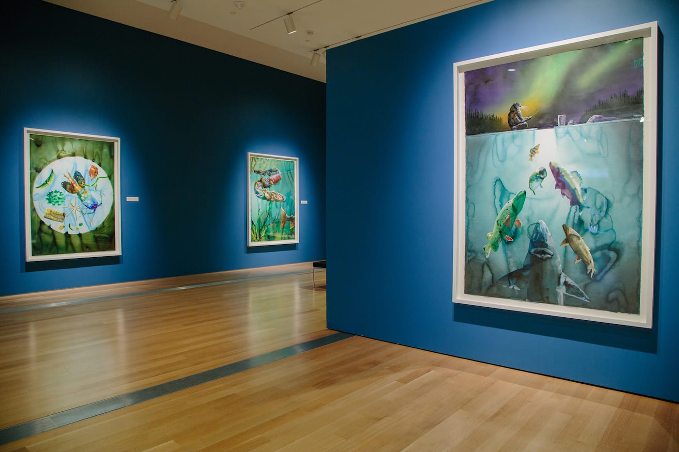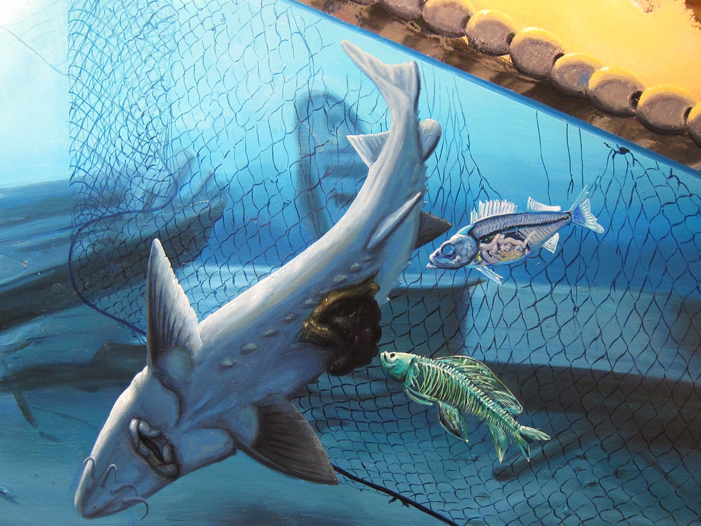 But the vast majority of his research spreads across five canvases, each measuring six by 12 feet. They do not correspond to individual lakes but rather present narratives on broad themes (fleshed out in discussion with Jill Leonard, a fish biologist at Northern Michigan University). The earliest completed one, “Cascade” (2015), centers on how humans have exploited the region for its wealth of resources over time. While one half shows wildlife, from caribou to a school of cisco, calmly swimming, the other shows a coal burning plant, an iron ore, and the slimy wastes of mines, among other traces of detrimental industries. Look closer, and you’ll spot a fur trappers camp in the background, near a commercial Seine fishing boat.