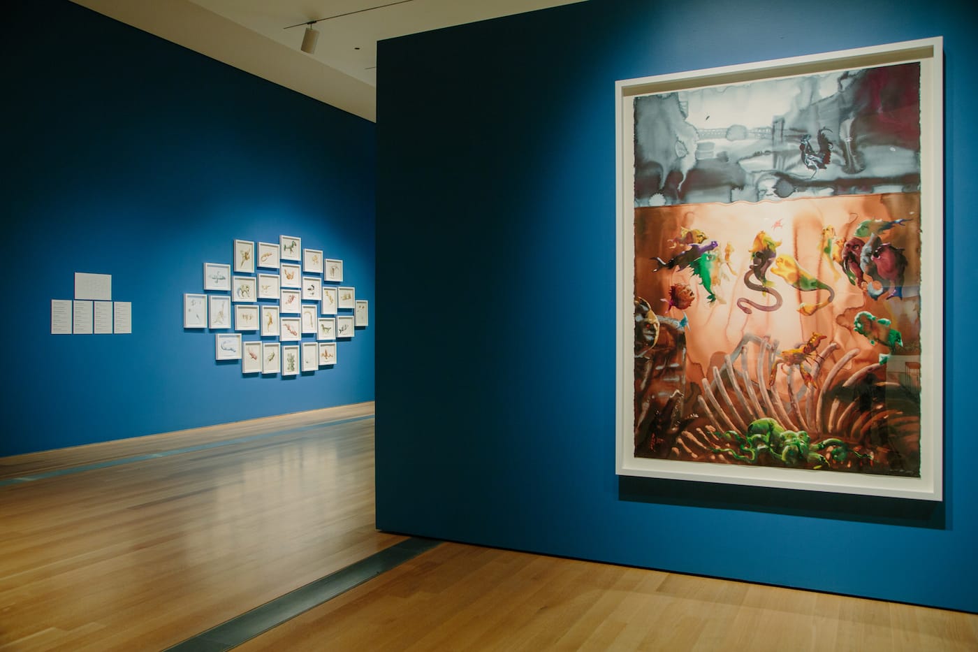 The Great Lakes Cycle, the five-painting centerpiece of Rockman’s current exhibition at the Grand Rapids Art Museum, is the result of his most involved project yet. Commissioned by the museum, which sits about 40 miles east of Lake Michigan, it involved Rockman traveling around the Great Lakes region to conduct extensive research. (The exhibition, too, will travel to five other institutions, all in cities around the Great Lakes.) He learned about its ecology from individuals in the recreational fishing industry, ichthyologists, anthropologists, and representatives from the Department of Fisheries. He then returned to his New York studio to paint the many environmental issues that plague the world’s largest freshwater ecosystem, from toxic algae blooms to invasive sea lamprey. Some of his ideas appear in an adjacent gallery of watercolors, a fantastic grouping that the museum has supplemented with Rockman’s ongoing series of field drawings of flora and fauna.