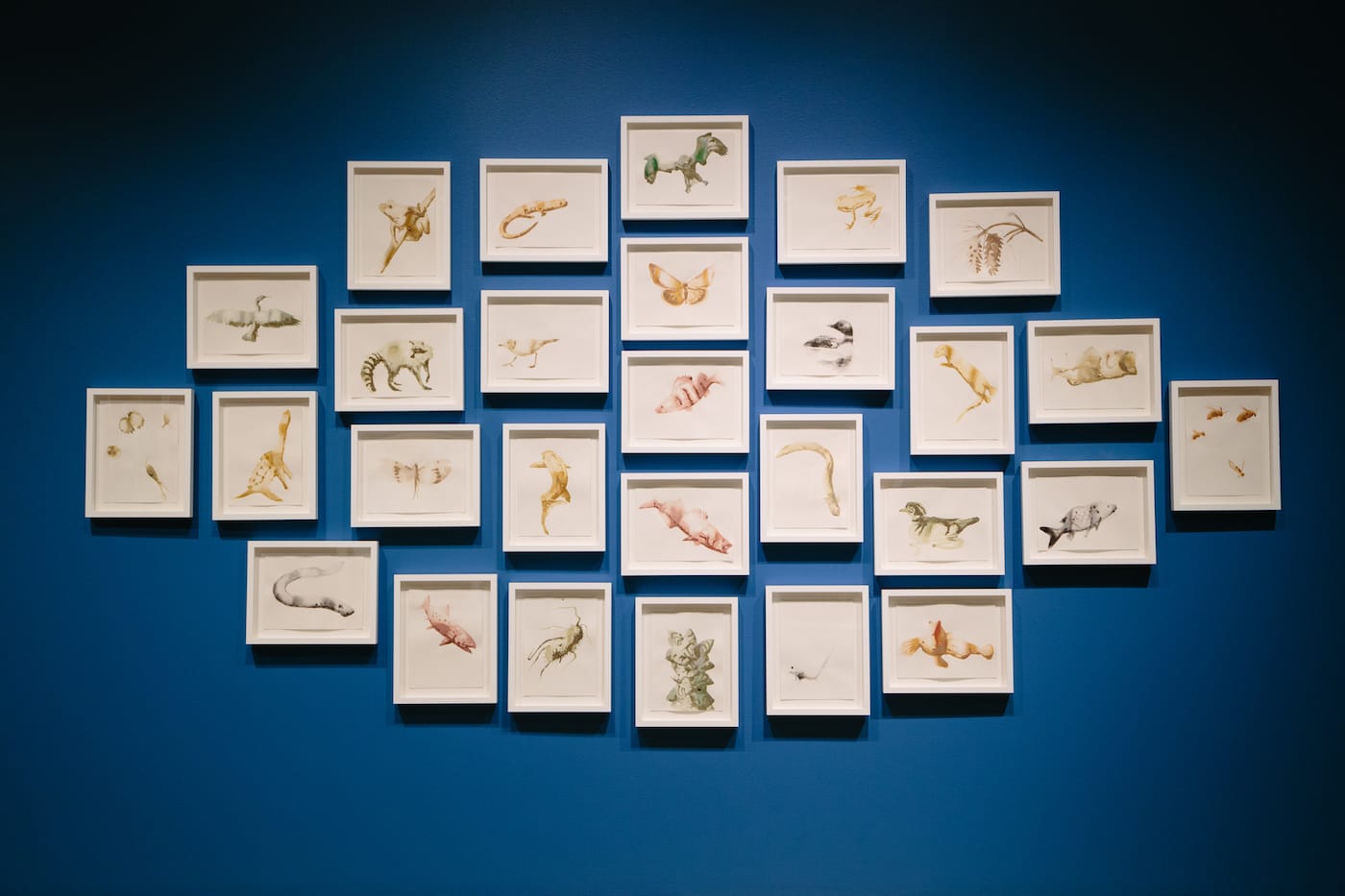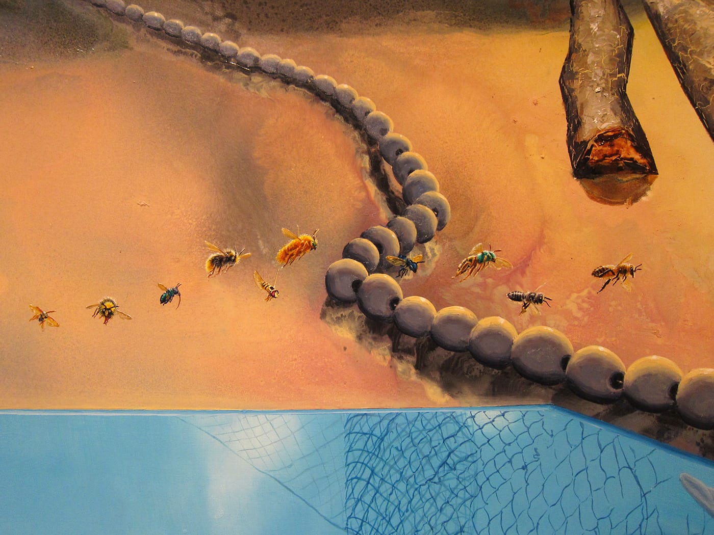 Part of why I consider Rockman’s task impossible is that this “Great Lakes region,” really, is an abstract, un-mappable area. The issues they face are global ones. Rockman’s painting, “Spheres of Influence” (2016), tackles this by examining the impact of migration routes that cross the Great Lakes. The sectioned view of a lake depicts boats and airplanes that have traversed the waters over time, alongside migratory birds and insects that move along flyways. Not one to neglect detail, Rockman also carefully depicts airborne contaminants. Every newcomer leaves its trace, whether it be pollution or invasive species, transported across oceans in the ballast tanks of cargo ships.