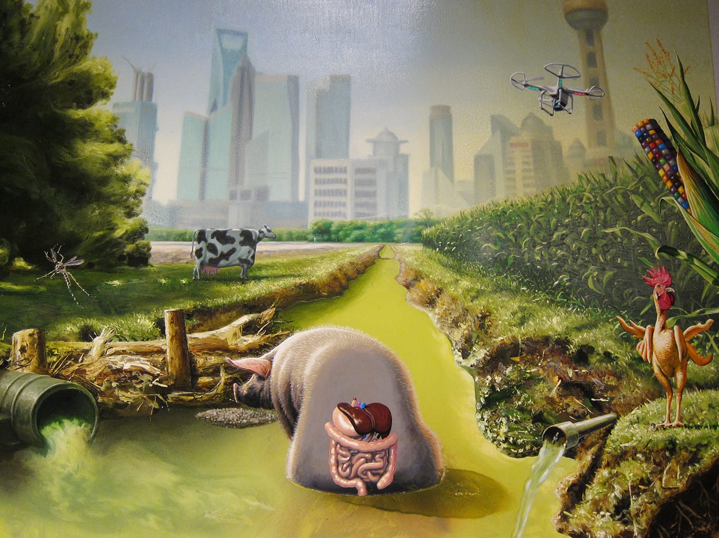 Much of The Great Lakes Cycle deals with past and longstanding plagues. More recent ones, as shaped by the development of our cities, are found in “Watershed.” This bucolic scene is tainted by glowing sewer runoff, genetically warped animals, and salmonella — represented by a defecating pig. Is this hyperbolized, grotesque vision of our present really the near future for the Great Lakes? It’s a question made more urgent by Trump’s repeated calls to cut funding for Great Lakes restoration efforts. Rockman doesn’t offer any solutions to enact change, but the scenes we confront are certainly a persuasive call to action.