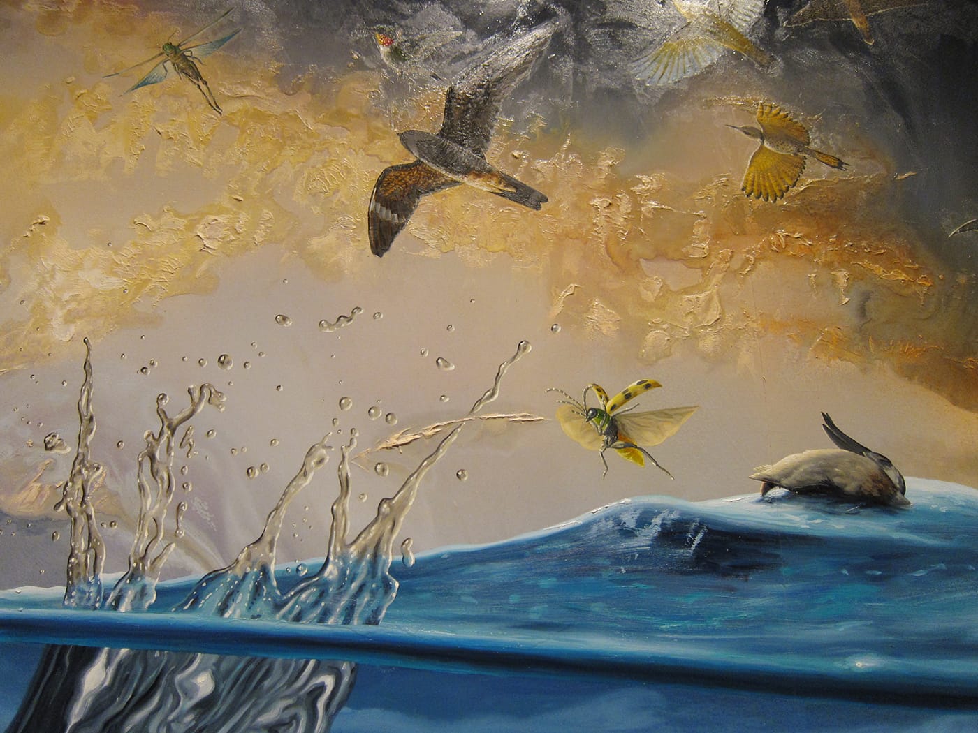 Rockman’s paintings are most powerful in how they visualize such relationships, showing how small-scale interactions are linked to major devastation. Reminiscent of dioramas, they present imagined but credible representations of real environments — organisms wouldn’t group all at once in real life as they do here, but how they behave is accurate. The links that Rockman highlights can be surprising. For instance, algae blooms are responsible for avian botulism as toxins move through the food chain, consumed by invasive zebra mussels and round gobies.