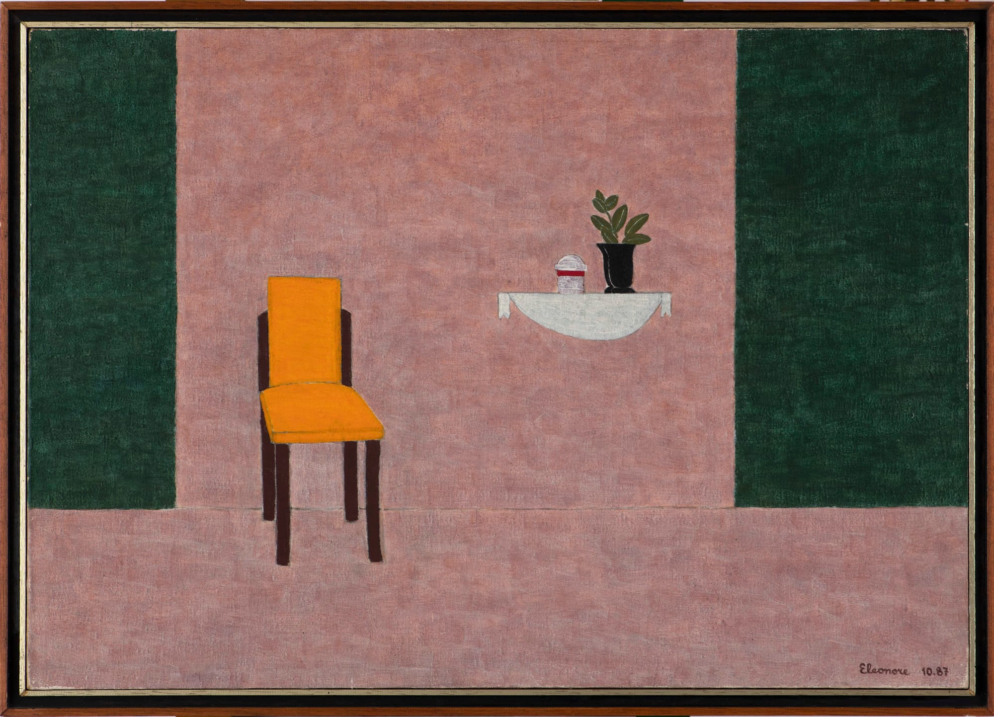 By contrast, Koch “came from a bourgeois background of German Jewish immigrants and had formal artistic training in Brazil and abroad,” Brunson noted. Although she absorbed elements of Volpi’s simplified forms and intense colors, Koch never left figuration behind. That decision would hinder her career in Brazil and eventually compel her move to London in 1968. Koch lived abroad for the next 20 years, painting quiet domestic scenes and imagined gardens inspired by England’s Neoclassical architecture. Despite their still, orderly feel, Koch’s sparse pictures of chairs, pedestals, and plants are searingly stark and subtly infused with feeling. By the 1990s, Koch had returned to Brazil. The paintings from this era exhibit a curious preoccupation with the canvas as a work space — shaped and modeled as a desktop — where writing artifacts like ink blotters and crumpled paper appear again and again.