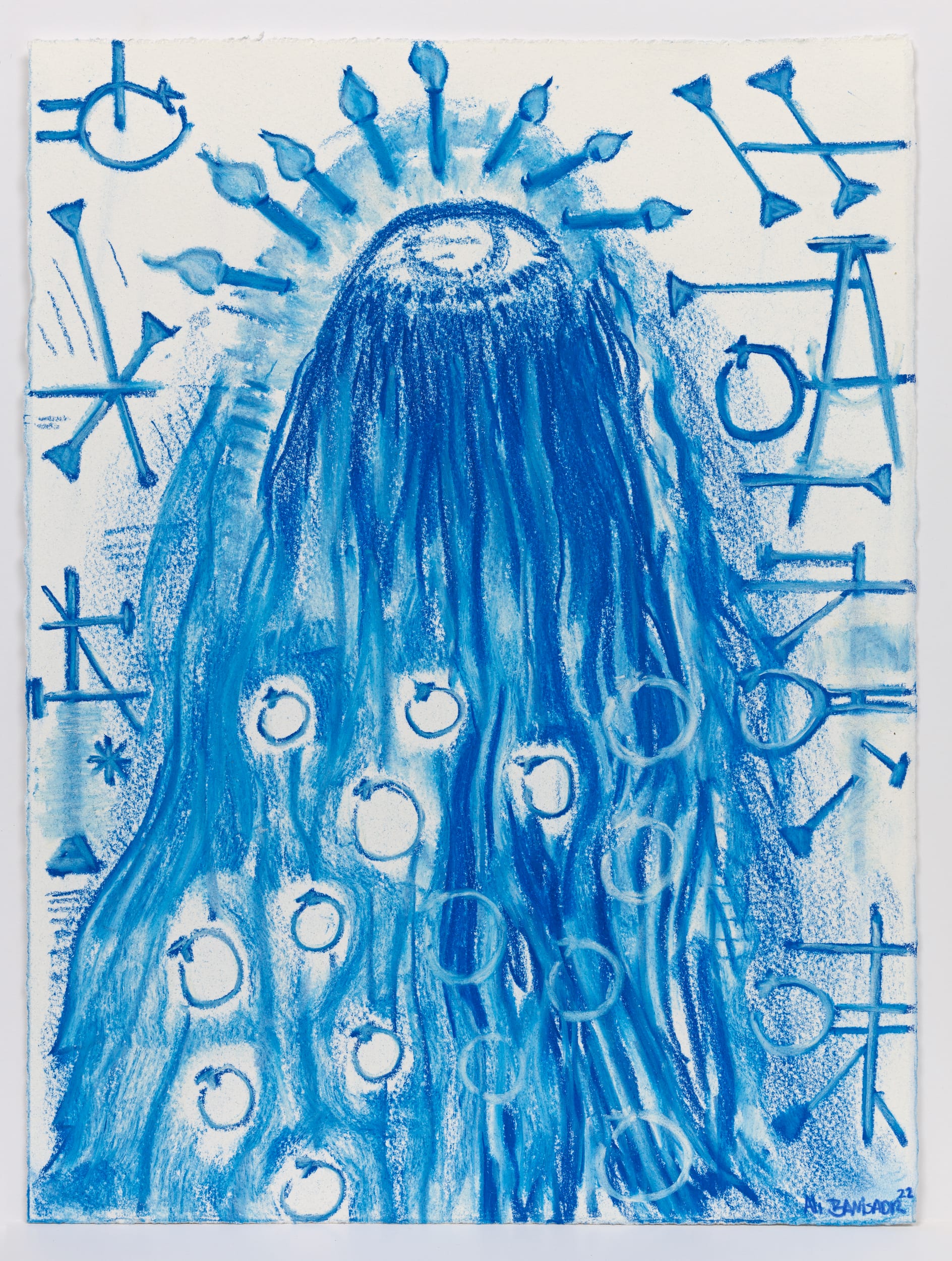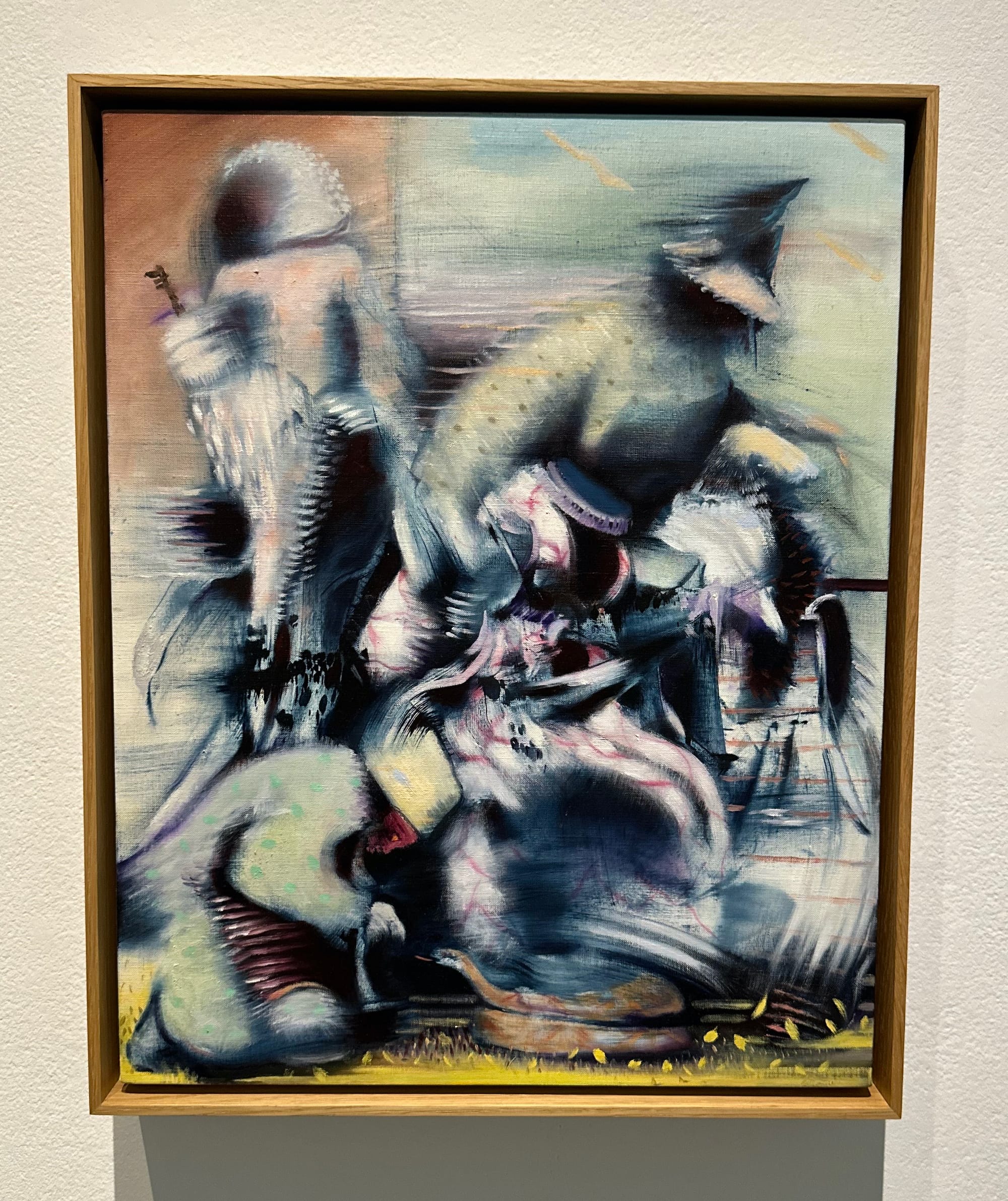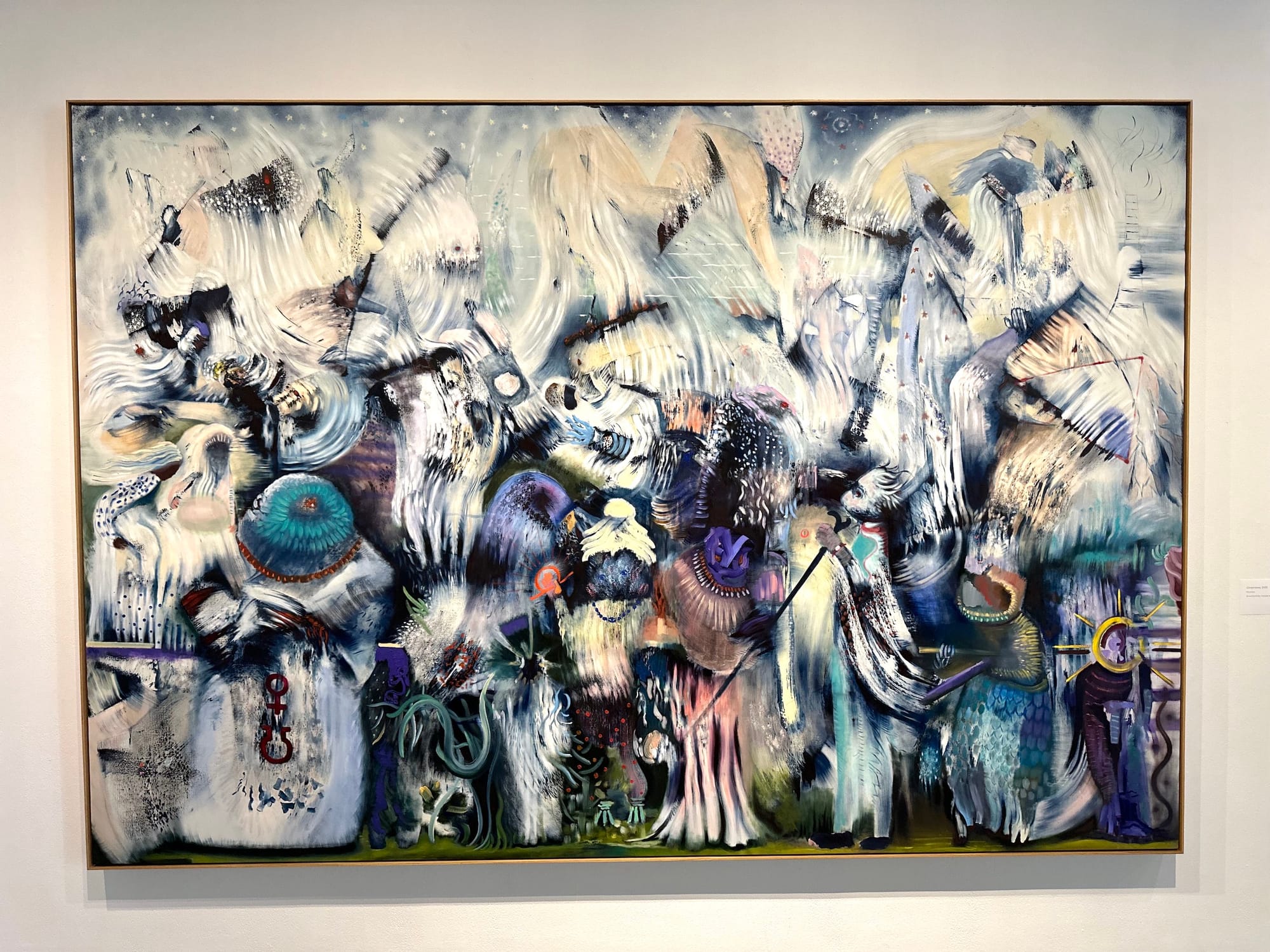 Take “The Serpent and the Key” (2019). Three or four, maybe five, figures are blurred as if a camera whose shutter speed is too slow is capturing their movement. The palette is primarily pale to dark blue, with highlights of lavender, green, and gold. A background figure with an orb for a head seems to hold an old, wooden key. Another figure, red-faced, wearing what might be a fez, bends down to charm a coiled snake, its tongue flickering forward, while some creature blurs above it, its intent unknown. There is a sweeping haziness to the whole, the horizontal brushstrokes more muted than those in “Black,” but just as kinetic, just as urgent, as if gale winds made their home in this place. He performs a similar set of moves in “Queen of the night” (2022) on a much larger scale, with foreground figures who have sea anemones or elaborately knotted ribbons for heads, and a throng of ghosts or angels or restless spirits billowing above them.