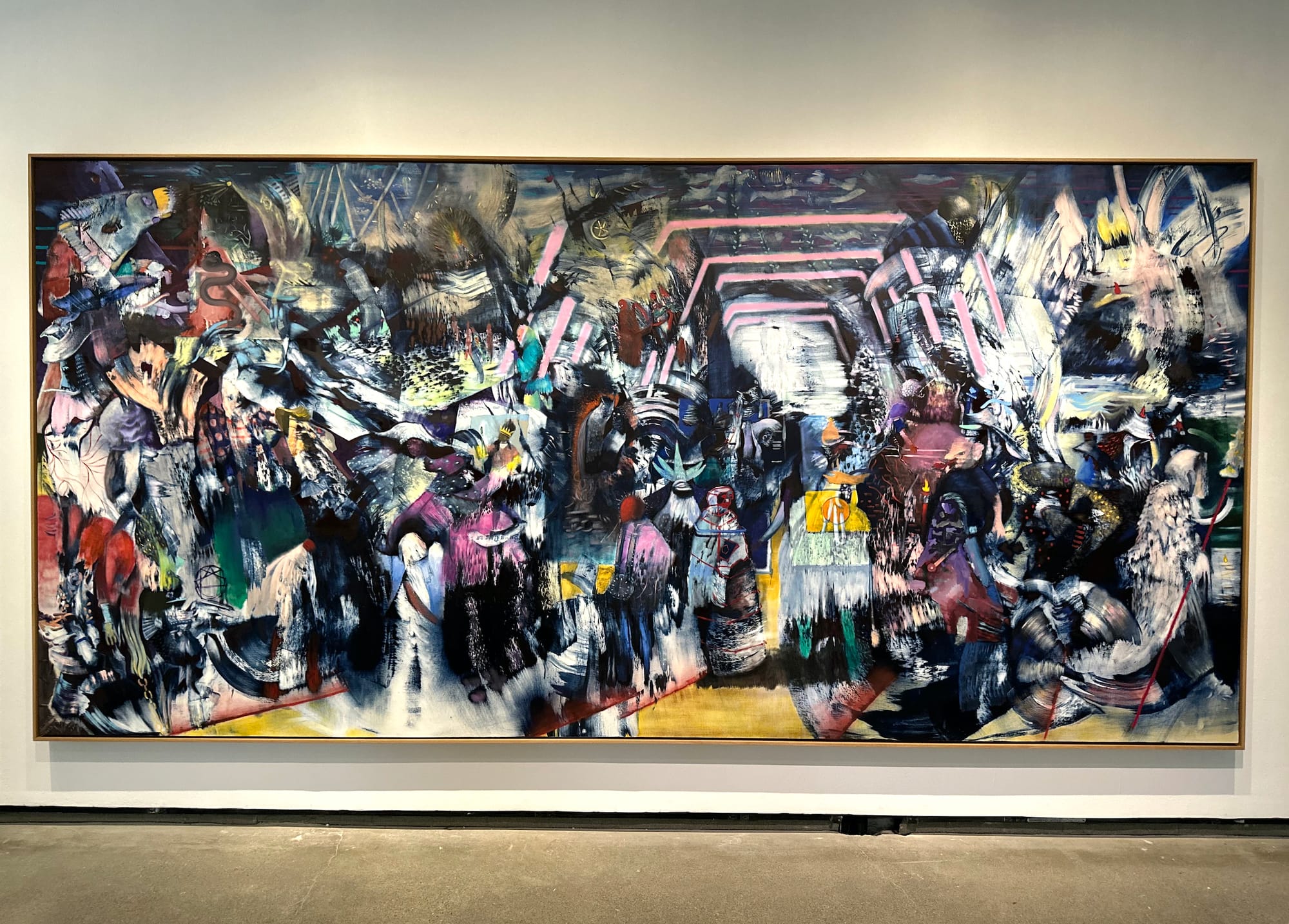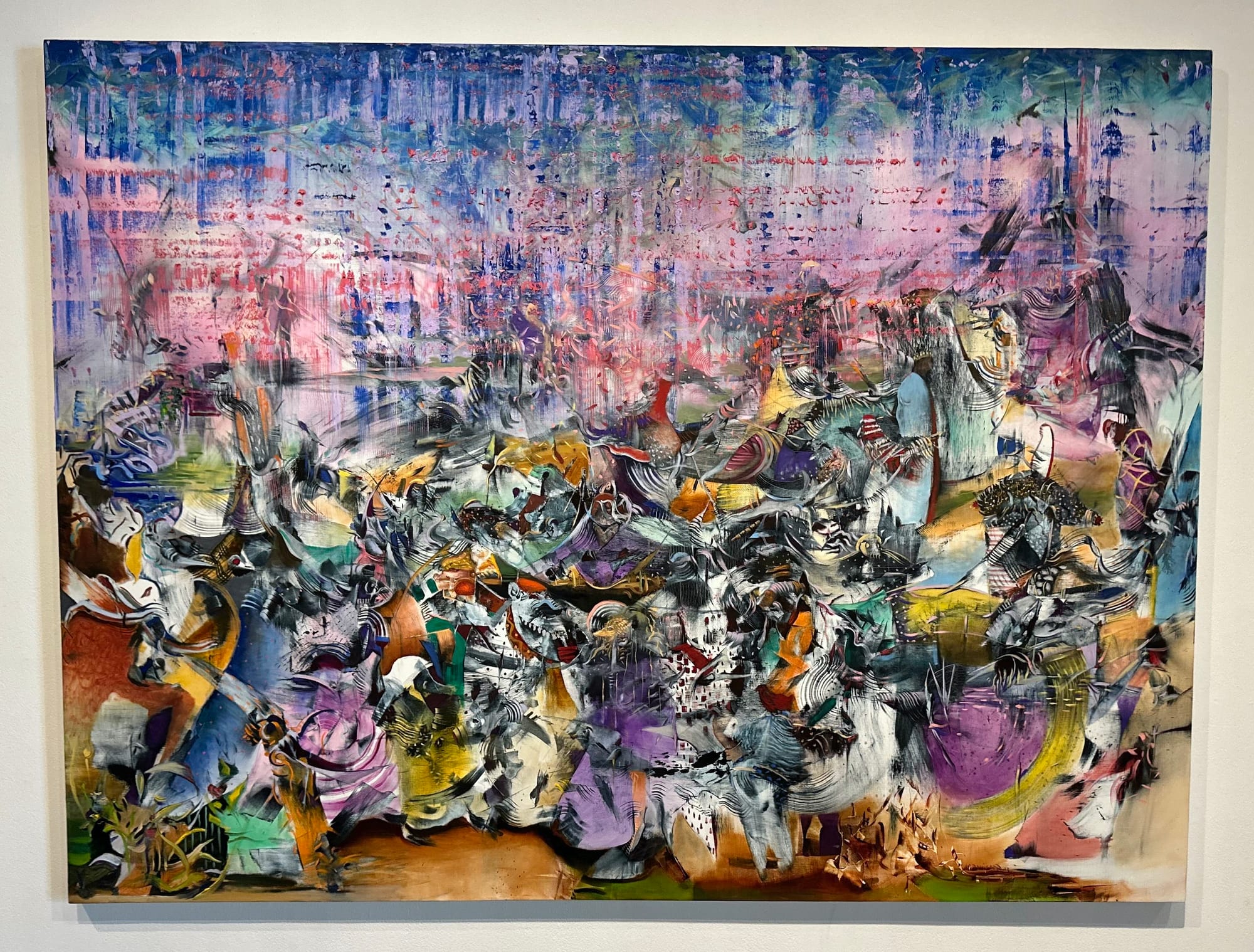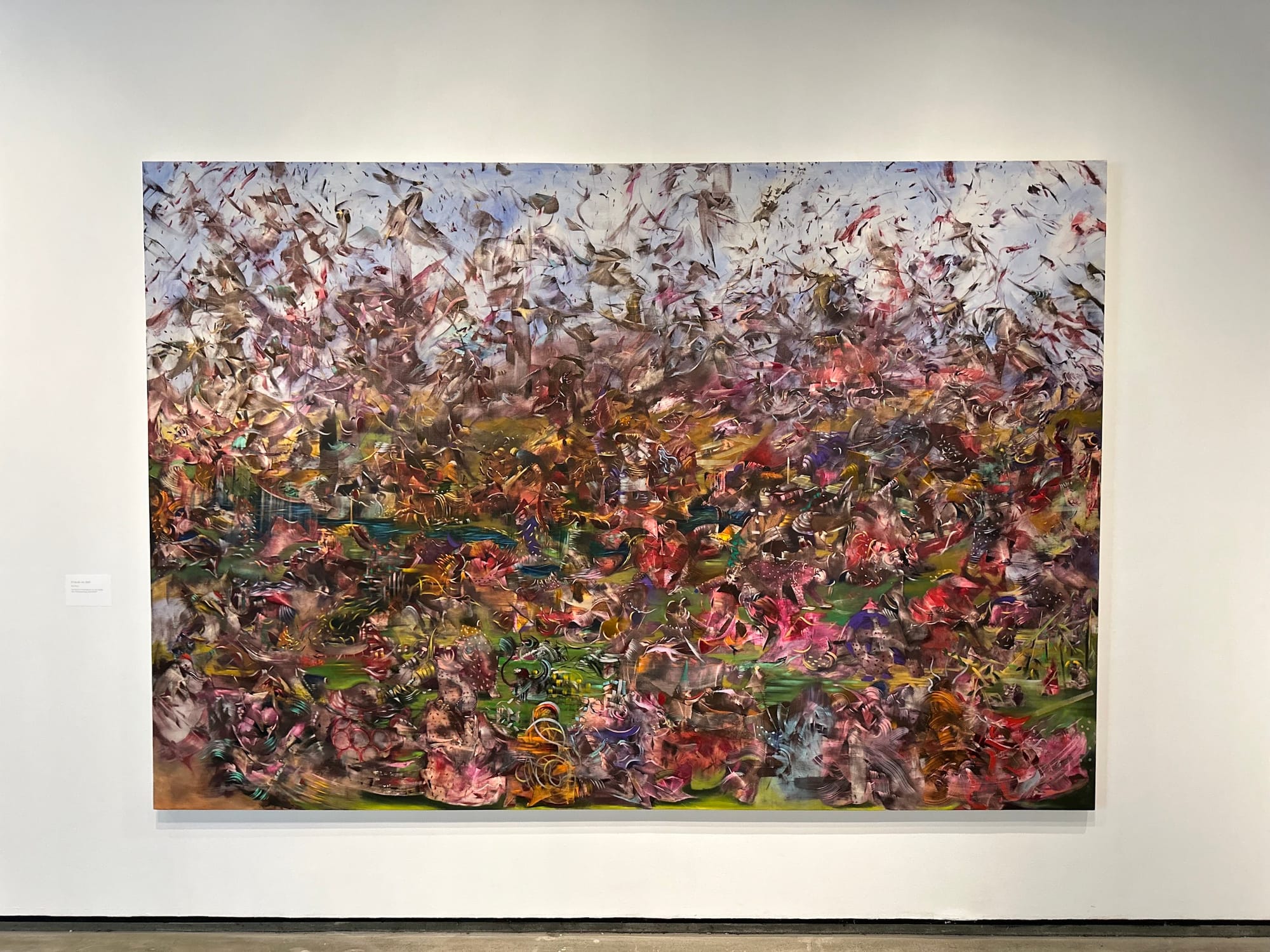 In the larger pieces, Banisadr makes the scenes more emotionally encompassing and fascinating, in some ways reminiscent of the narrative paintings of Hieronymus Bosch. But unlike Bosch, Banisadr isn’t illustrative. “These fragments I have shored against my ruins” (2023), measuring 86 by 180 inches, is perhaps my favorite in the show. There is such ruction of action spilling out toward me that I can’t tell whether the shapes are actual figures. But occasionally I can discern a head, sometimes wearing a crown, with an eye or two visible, and something like a body below that. The palette is so variegated that I can’t say one hue is dominant. They vie with each other for attention and for space. Near the center is a series of pink bands expanding as they move toward the foreground, as if they represent a portal, and the denizens of some other realm had made their way through to trouble our own. It provides no orderly entrance or exit; this is reminiscent of life, despite our best efforts to make it mannered and civilized.