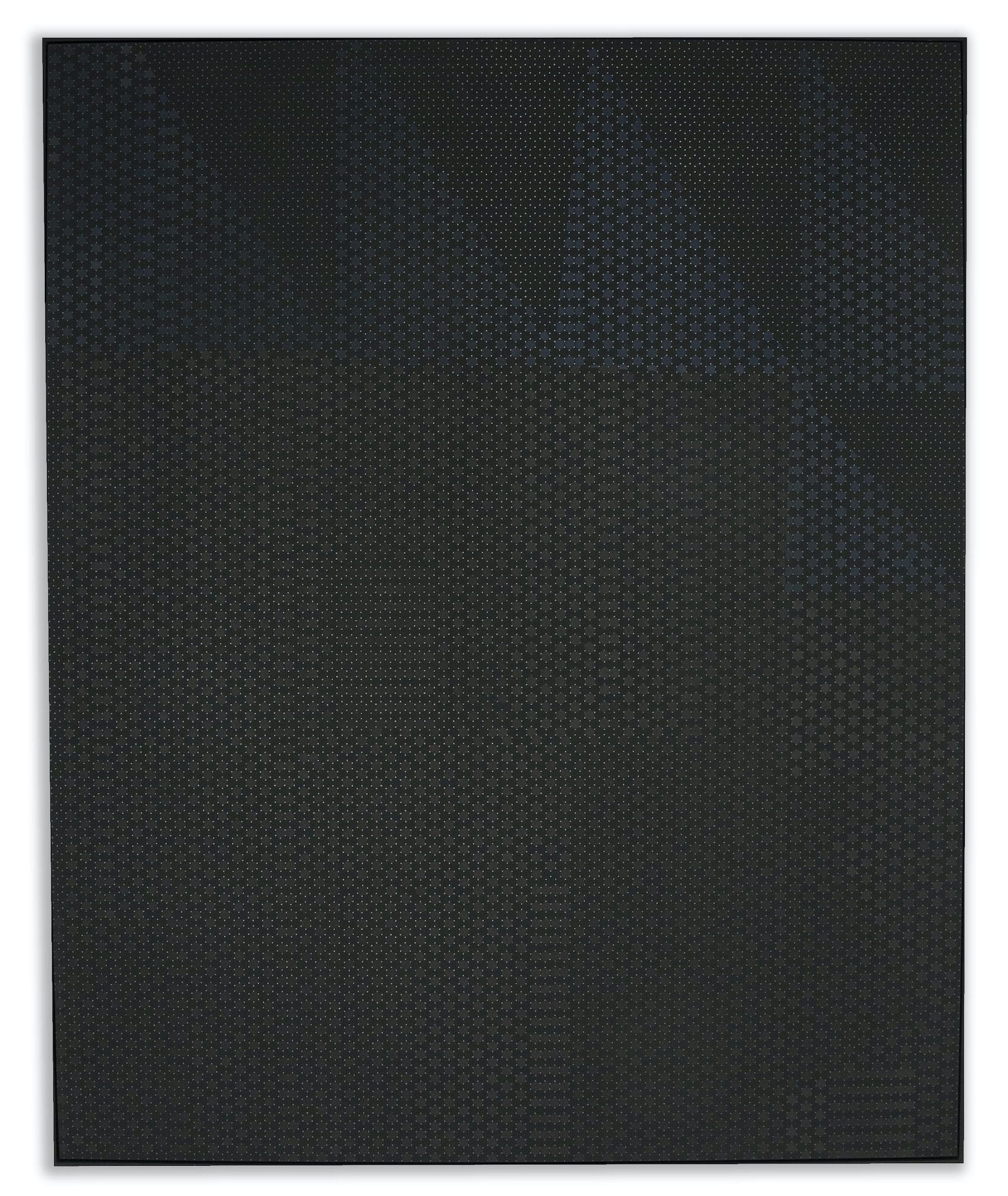 The interaction between the graphite dots and the black ground changes constantly throughout the painting. The effect is hypnotic. You have to slow down your looking, to shift your focus from whole to part. Along the upper quarter of “I’ve Been A Fool” (2022), the black ground is divided into interlocking scalene triangles composed, alternately, of dark gray orbs, surrounded by graphite dots, and of hexagons of dots. There is something maddeningly beautiful about the visual state she achieves in this painting. I kept looking for some underlying pattern that would anchor everything, but I didn’t find one. Was I seeing what was there or was I beginning to hallucinate? That state of seeing but not quite knowing suggests one possible explanation for the painting’s title. Or it could be the artist’s commentary on her meticulous devotion to making this painting, and the degree of minute concentration it requires. The beguiling geometry of this painting is simultaneously stable and shifting.