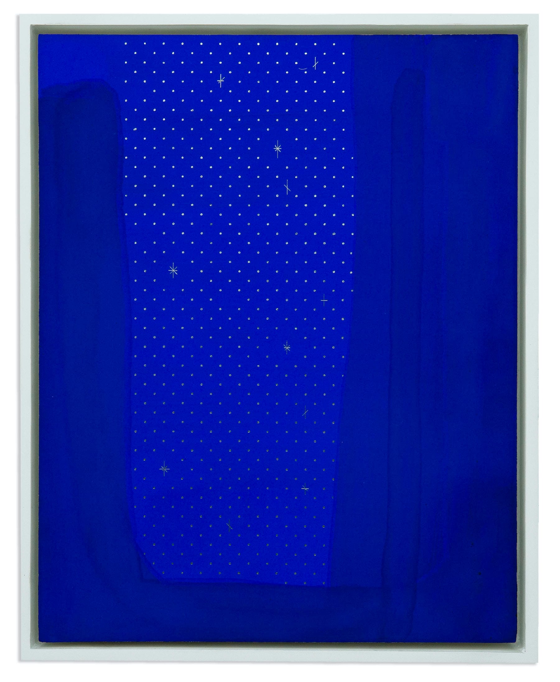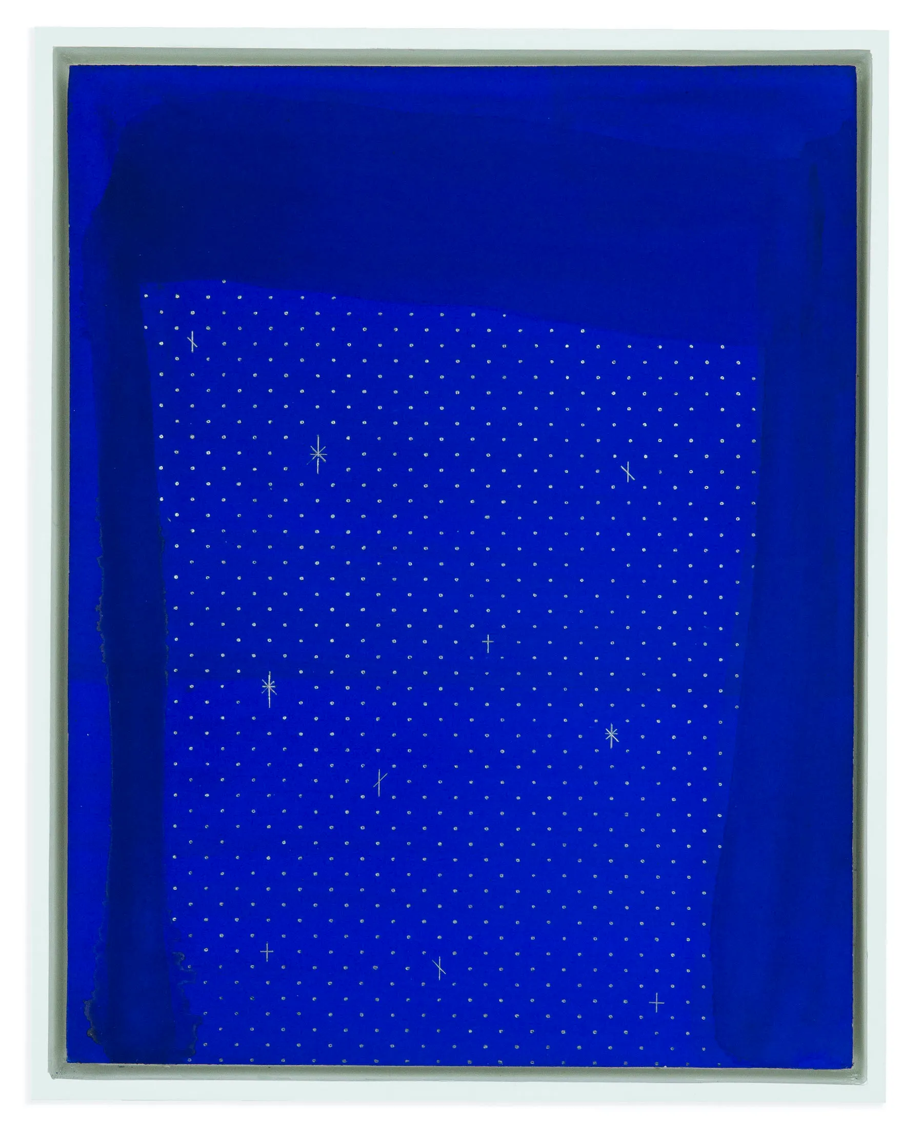 The paintings in A Ballad measure 9 1/2 by 7 1/2 inches, between the size of a book and a standard sheet of paper. Each one contains an irregular rectangle filled by a grid of dots, some of which are drawn as linear stars. The grid and lines defining the stars are meticulously placed. Working in oil and graphite on a plaster surface that has been sanded until smooth and flawless, Hall makes the grid dot by dot, transforming some into stars by adding two to three lines. What distinguishes each of the paintings is Hall’s framing of the grid with a dark blue band of thinly applied paint.