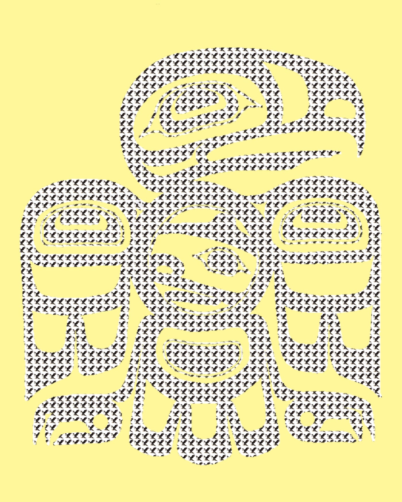 Marks’s sculptures, paintings, and textiles often appear gently familiar, but then take a deeper, more troubling turn. In One Gray Hair — the artist’s first solo museum exhibition — there is a series of digital prints that merges formline design with emojis. The set of familiar animals — a bear, eagle, frog, owl, and wolf — depicted in thick, white outlines backed by bold colors feel almost too easy, at first. Emoji versions of each animal fill in the outlines to create a pixel-like texture that nods to the warmer emotional quality similar animals add to text messages — a quality so easily lost in digital conversations. However, in nearby text, Marks describes the Tlingit language as “critically endangered,” expected to lose all fluent speakers by 2030. In this context, the formline emojis lose their buoyancy. I wondered what digital conversations would look like with more influence from Tlingit perspectives and imagery, if Native American languages were better supported by technology rather than pushed towards extinction.