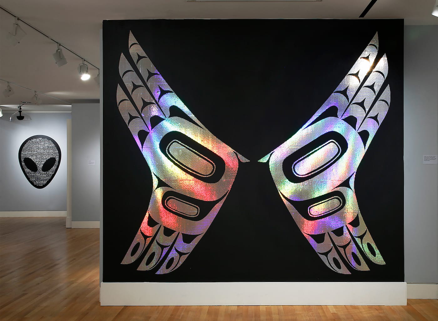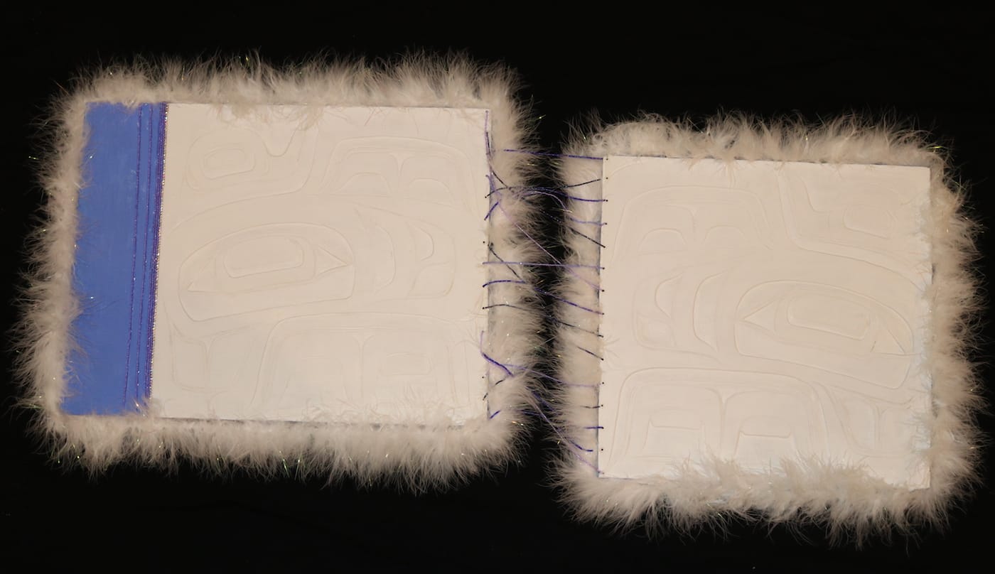 Marks employs unexpected combinations of materials as she probes these questions. The sculpture “Text Me” (2017) is comprised of two carved panels made from cedar, latex, and artificial feathers, connected by thin strands of plastic beads. Coating formline carvings in white and adding synthetic details brings out the mass produced quality we associate with cheapness, particularly in contrast to the fine woods more typically used in traditional Native American works of art. Yet, plastic is undeniably durable, giving it an eternal advantage over wood’s natural process of decomposing over time, prompting questions of what sacrifices are acceptable when survival is uncertain — do new materials reworked with traditional methods sustain culture in a way that lasts without losing its original values and meaning?