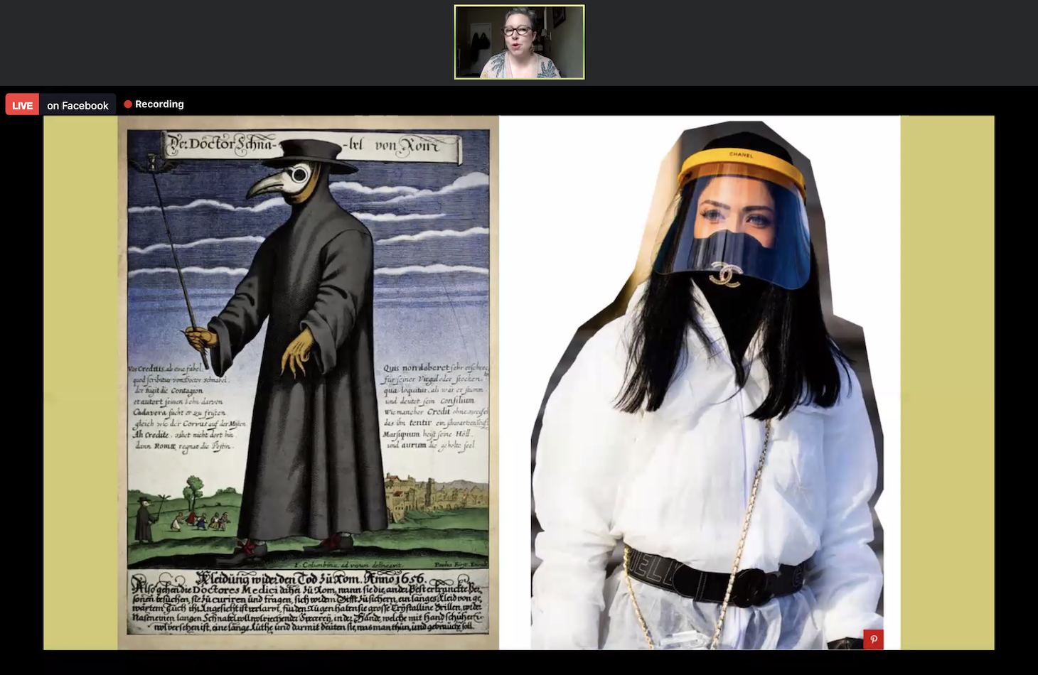 The other major clothing item we’re all thinking about is, of course, masks. In one of her cleverly illustrated slides, Matthews David compared the masks that plague doctors wore — equipped with a beak infused with sweet smells, which were thought to be protective — to the “more modern” prototypes being fabricated by the likes of Chanel.