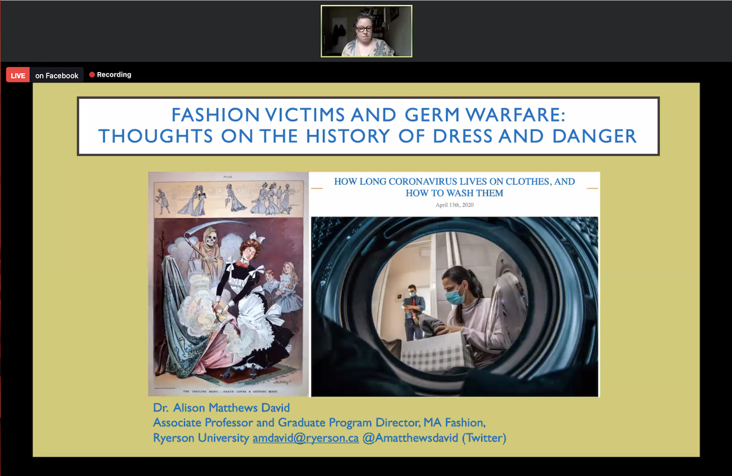 On Tuesday, Matthews David was invited by New York City’s National Arts Club to share her research in a Zoom talk titled “Fashion Victims: Germ Warfare.” (The presentation drew heavily from her book Fashion Victims: The Dangers of Dress Past and Present.) The topic is only timely, as we consider what to wear and how to protect ourselves during the COVID-19 pandemic. Do virus particles spread through clothes? Should we wash our clothes every time we leave the house?