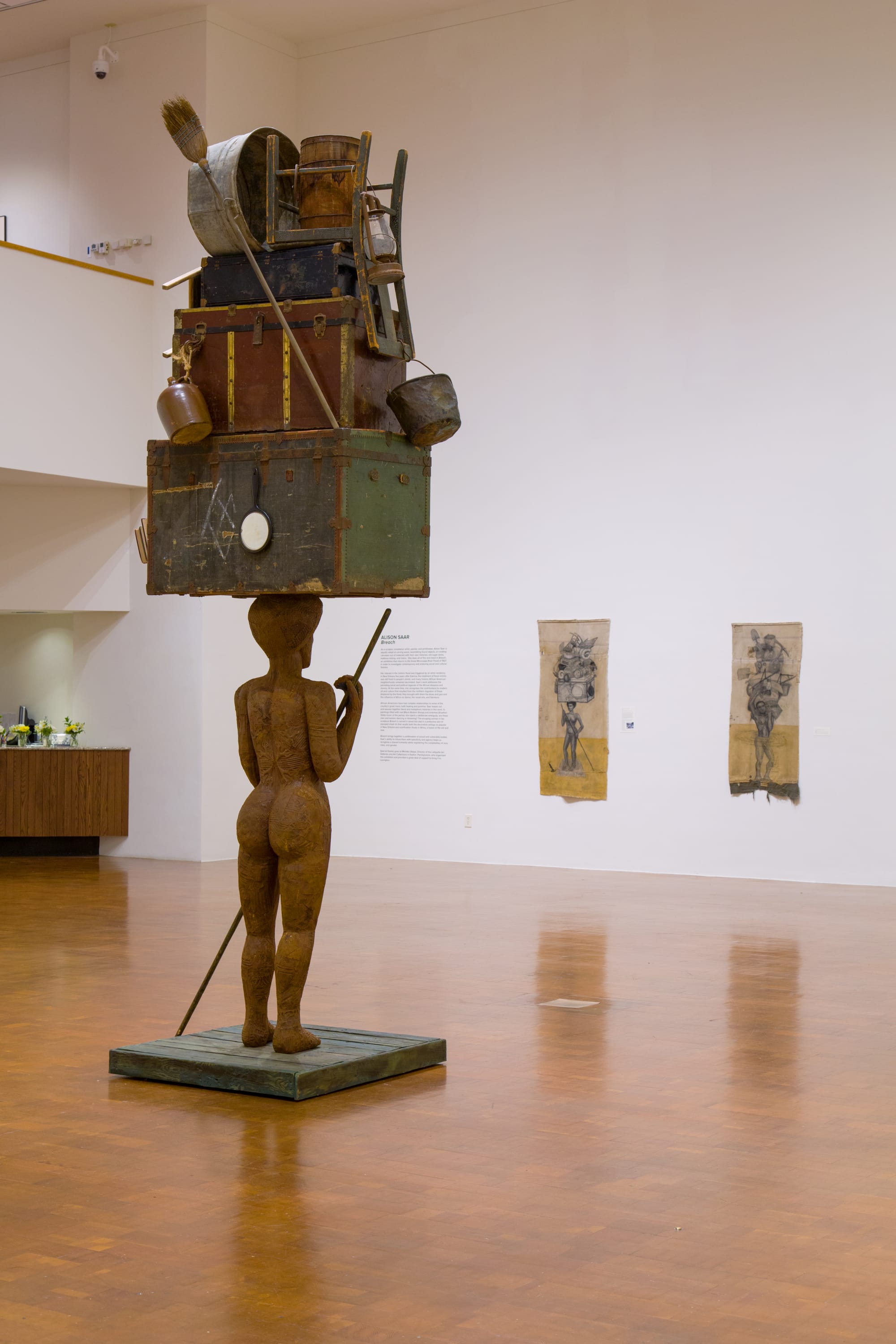 The weight that rests upon her head — the symbolism of which is quite clear — seems almost impossible to balance, and yet the drawing mirrors the exhibition’s central sculptural work, an almost 13-foot-tall tableau of a life-sized woman, made from wood and ceiling tin, pushing herself along the river, with the same steamer trunk and domestic objects stacked high above her head. The oar she holds ends at an angle where it hits the floor; in Saar’s words, “the floor of the gallery becomes the water […] and so we are all in the water with her.”